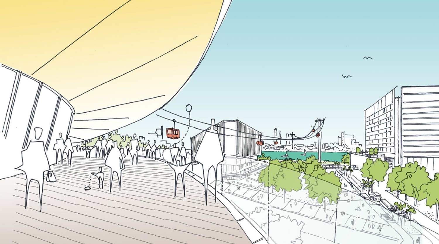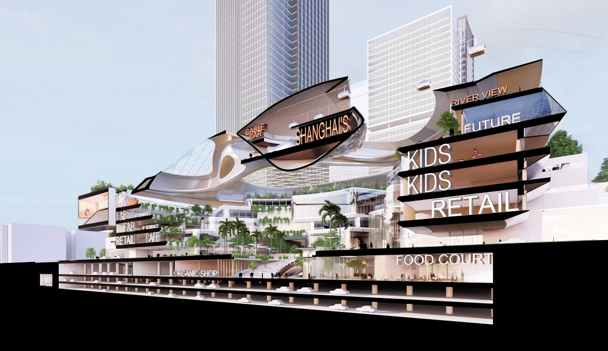 别树一格的的商场顶部设有极具雕塑感的缆车站,与即将在黄浦江对岸建成的上海大歌剧院互通。这楼顶缆车站为这座建筑增添了未来感,并为黄浦江和现代化的西岸天际线提供了极致景观。同时,缆车站顶部种有苍翠葱郁的绿植,作为对岸河滨公园的延伸。
