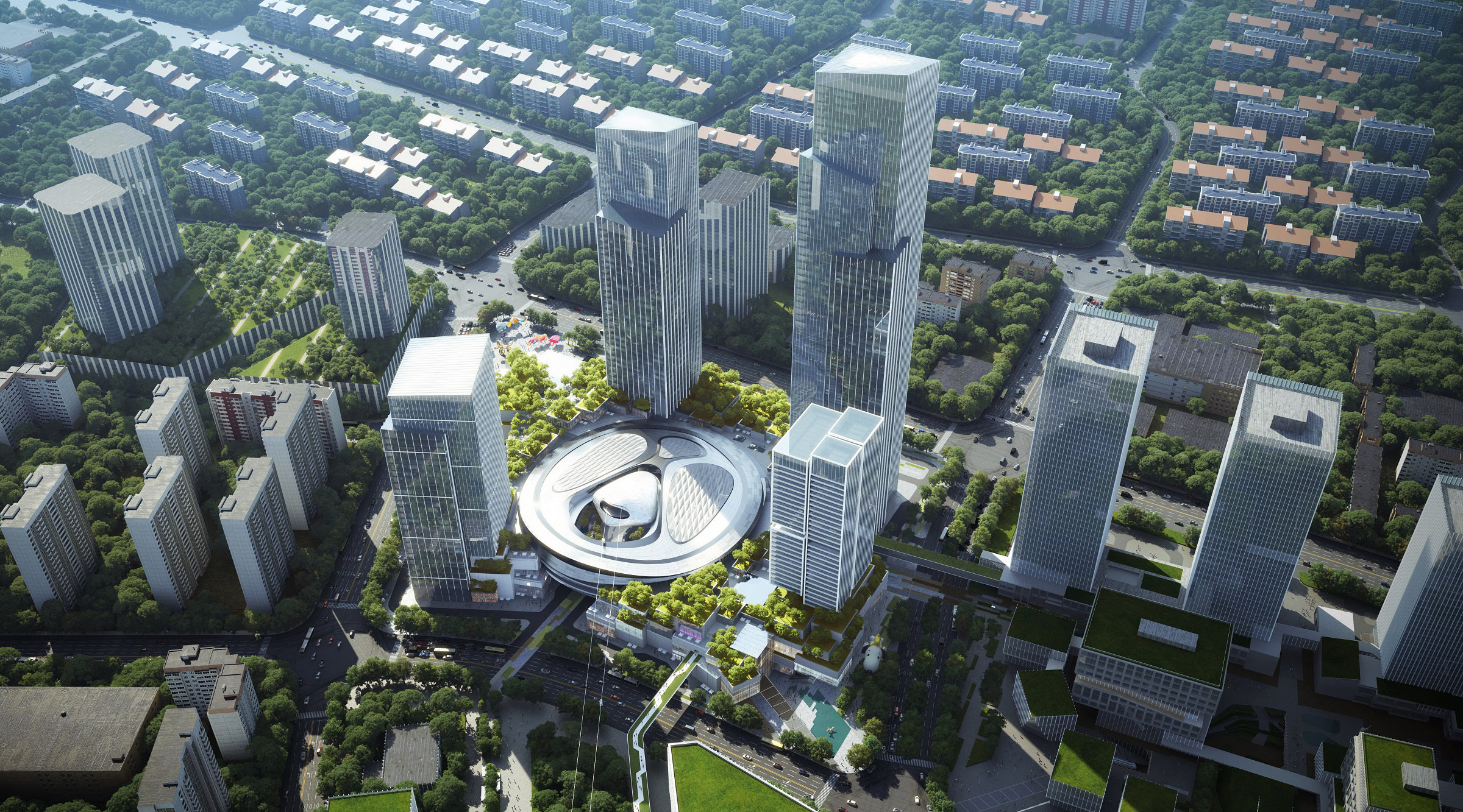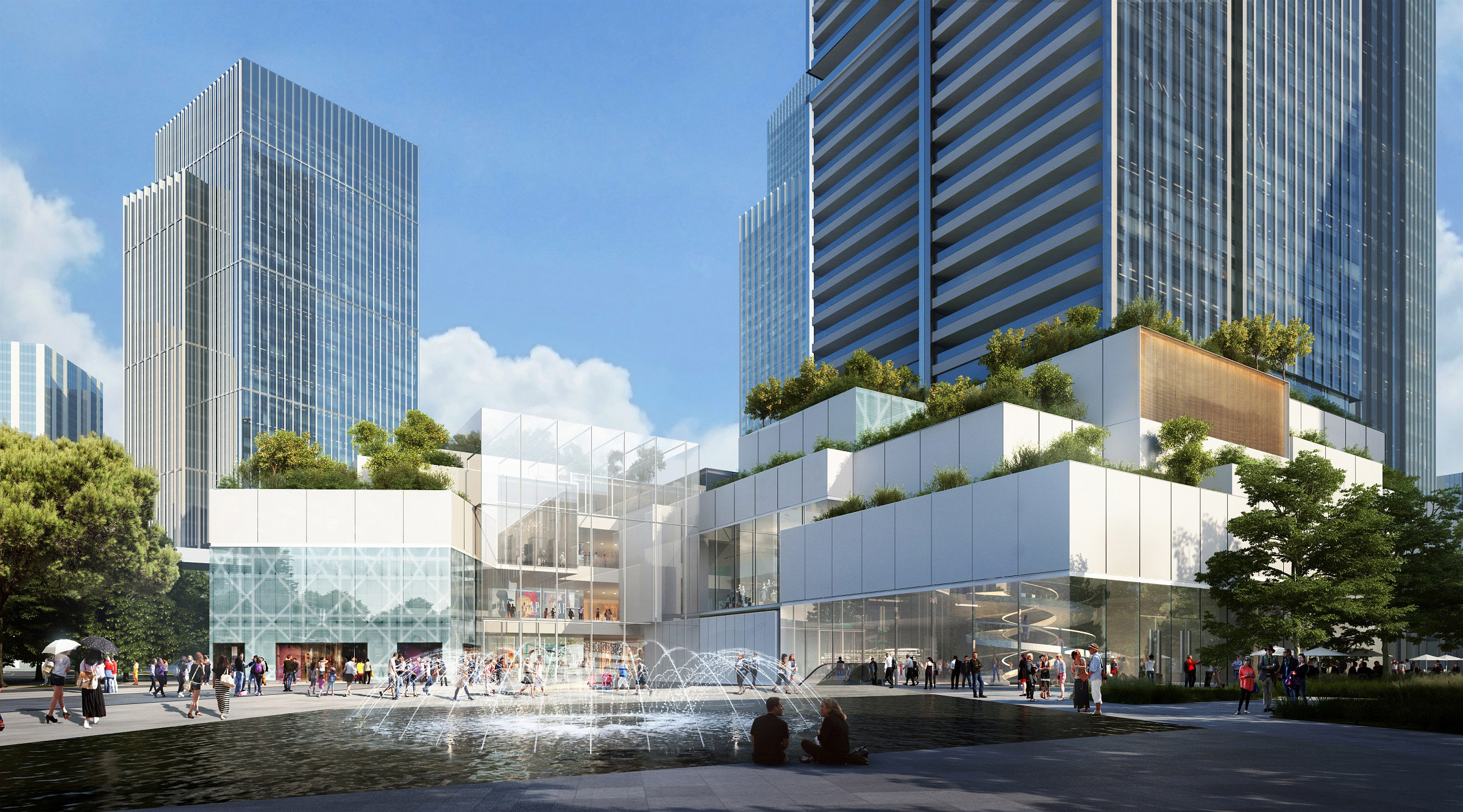 C&D 地块建筑面积为 492,000 平方米,10 Design 在庞大的零售地块上采用了独特的六通道零售布局设计,让访客们可通过不同入口往绿色中央广场汇集,提高流动性和互动性。该项目由设计合伙人 Chin Yong Ng(黄劲荣)与 Lukasz Wawrzenczyk 领导,设计模糊内外界限,将室内外空间集中融合进五层高的中央购物中心。方案亦以一个连续的环形动线紧密串联着三座高层办公塔楼、一座公寓塔楼,一家塔尖酒店以及高端零售商业街。受当地传统城镇肌理的启发,购物广场中央将塑造成绿意盎然的开放式广场,以绿林和自然日光环绕。