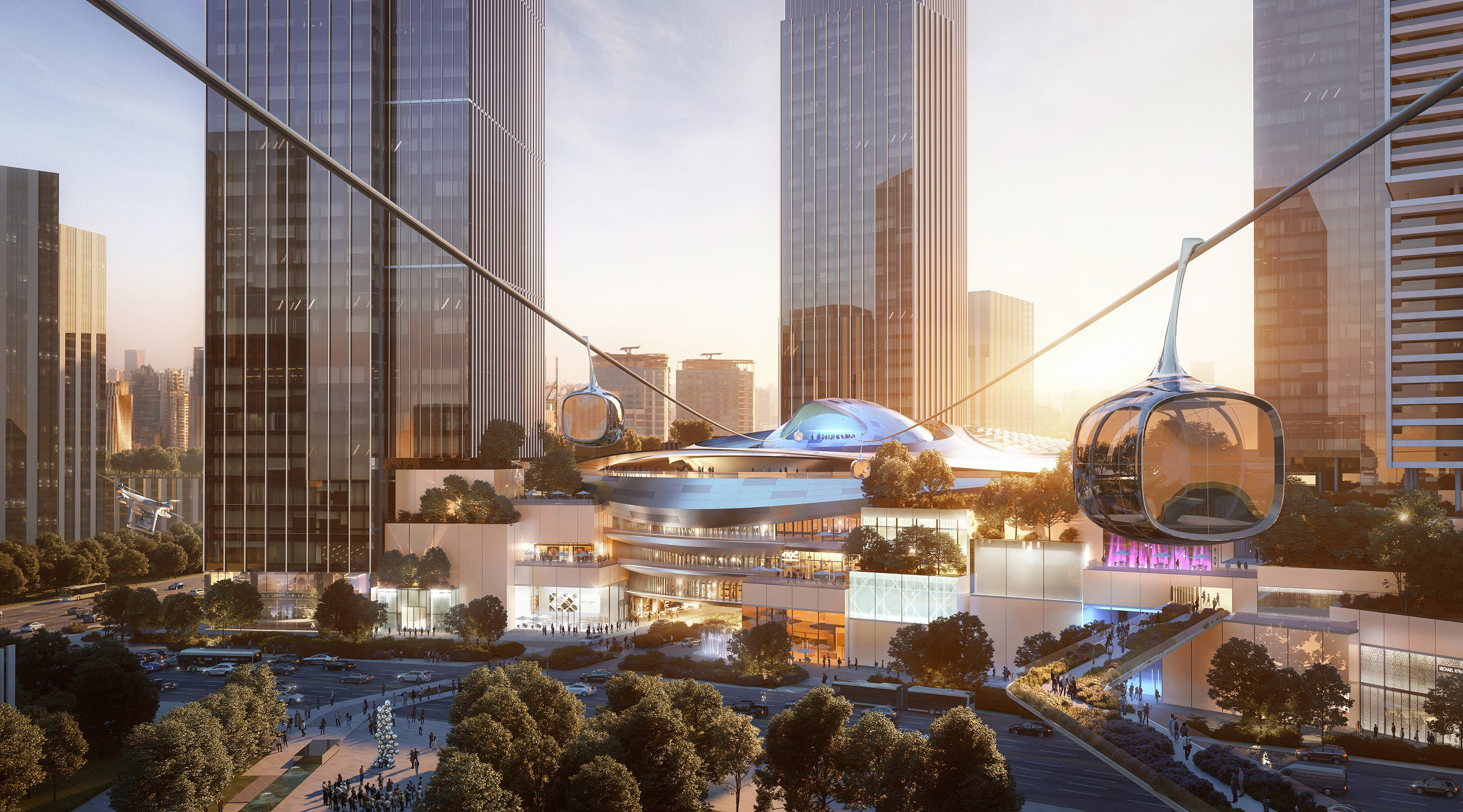 餐厅、咖啡室和酒吧设在较高楼层,环绕采光穹顶布置,吸引人们前往高层商业,进一步探索空中酒吧街及儿童游乐场。商场顶上特别设计一个悬浮舱体,包含观景平台、海派探知馆和缆车站等特色功能。