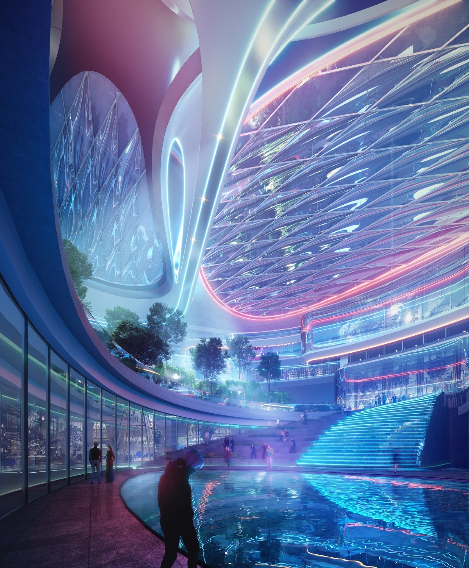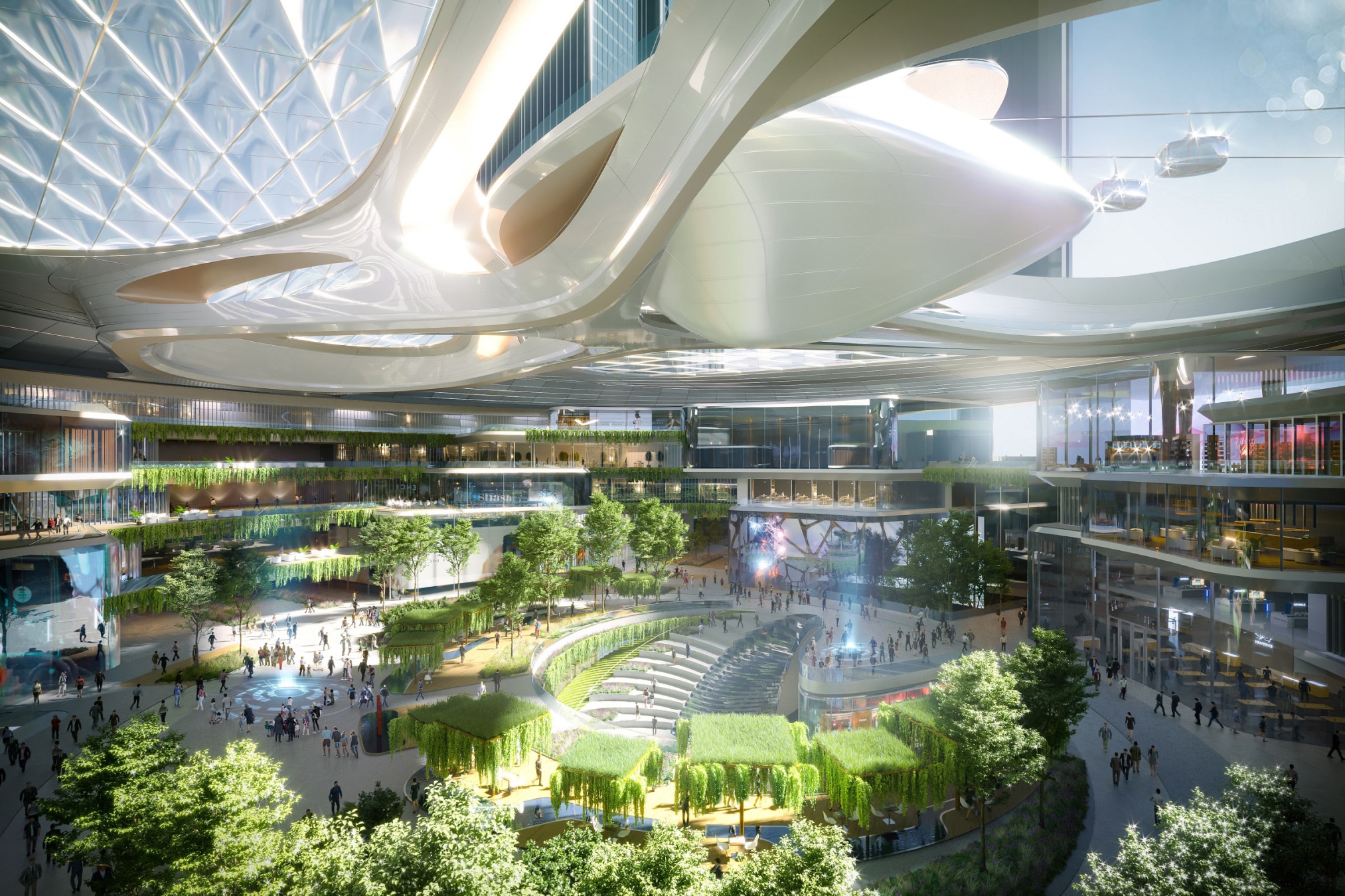 广场以圆形半透明 ETFE 材质覆盖,形成独具一格的半室外穹顶空间,把自然光透射至商场深处。晚上,广场将变身为多功能公共空间,提供表演和展览等活动场地,也可利用其梦幻般的照明装置进行投影展示,为公众打造一个全年无休的文化目的地。