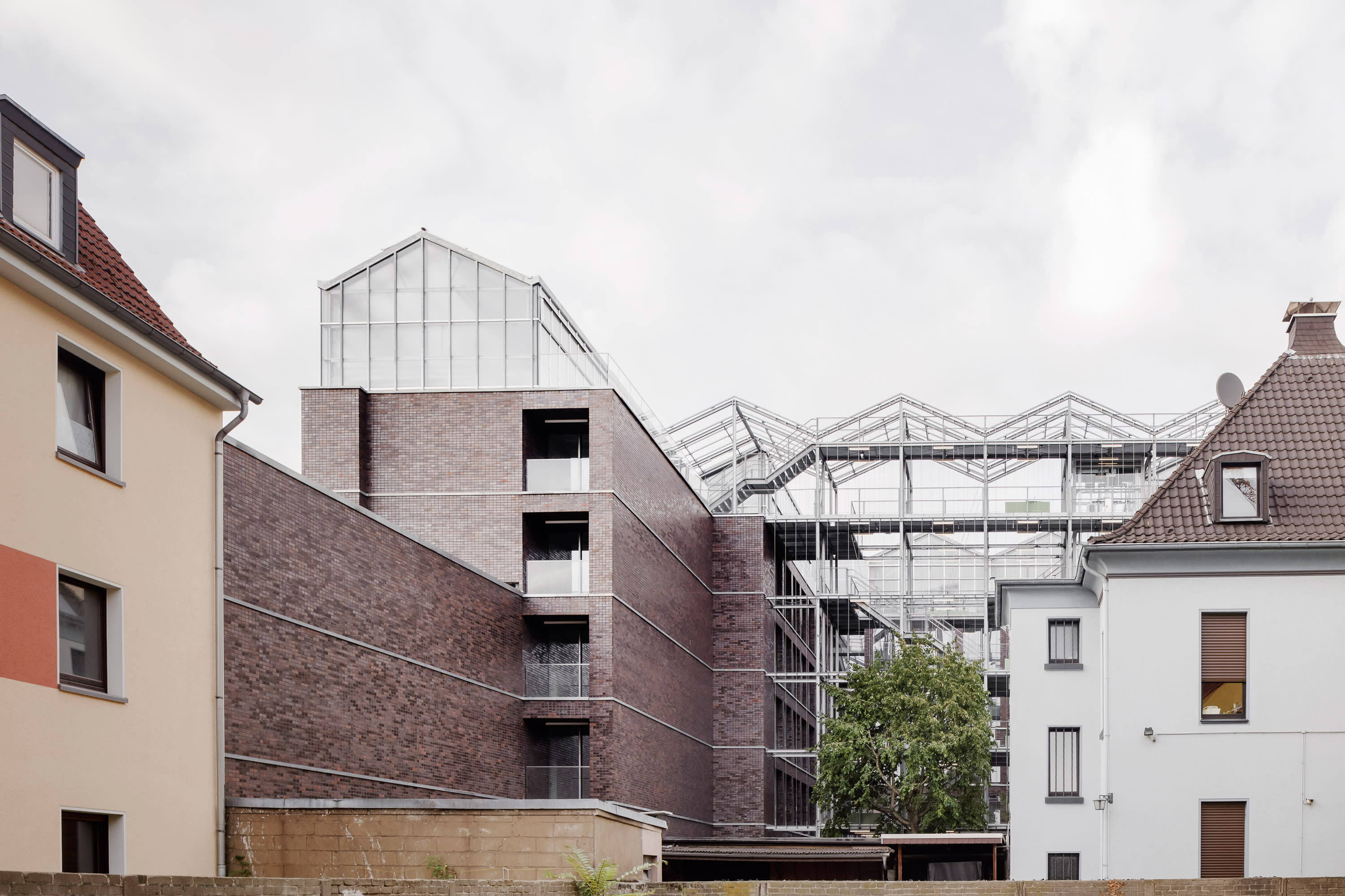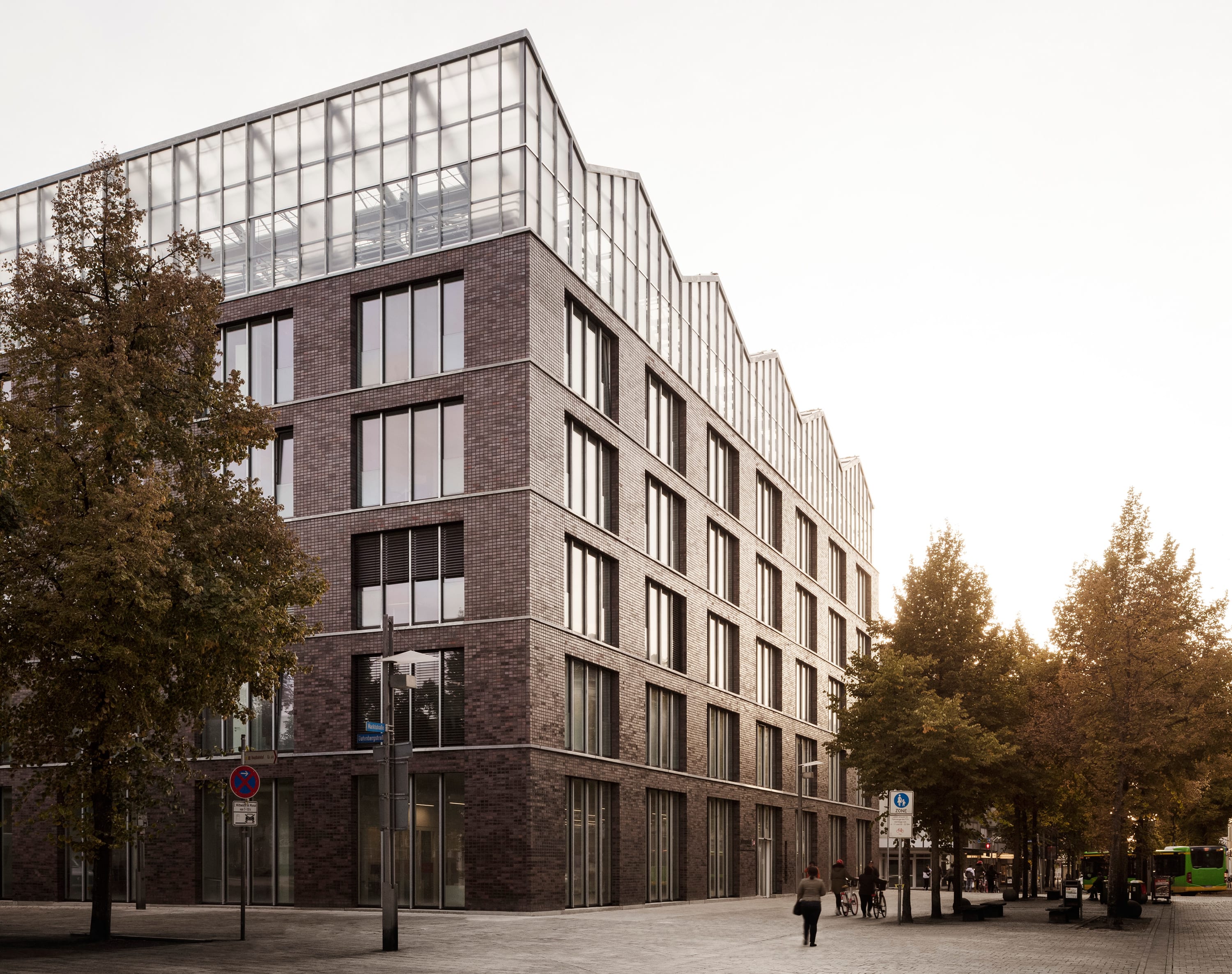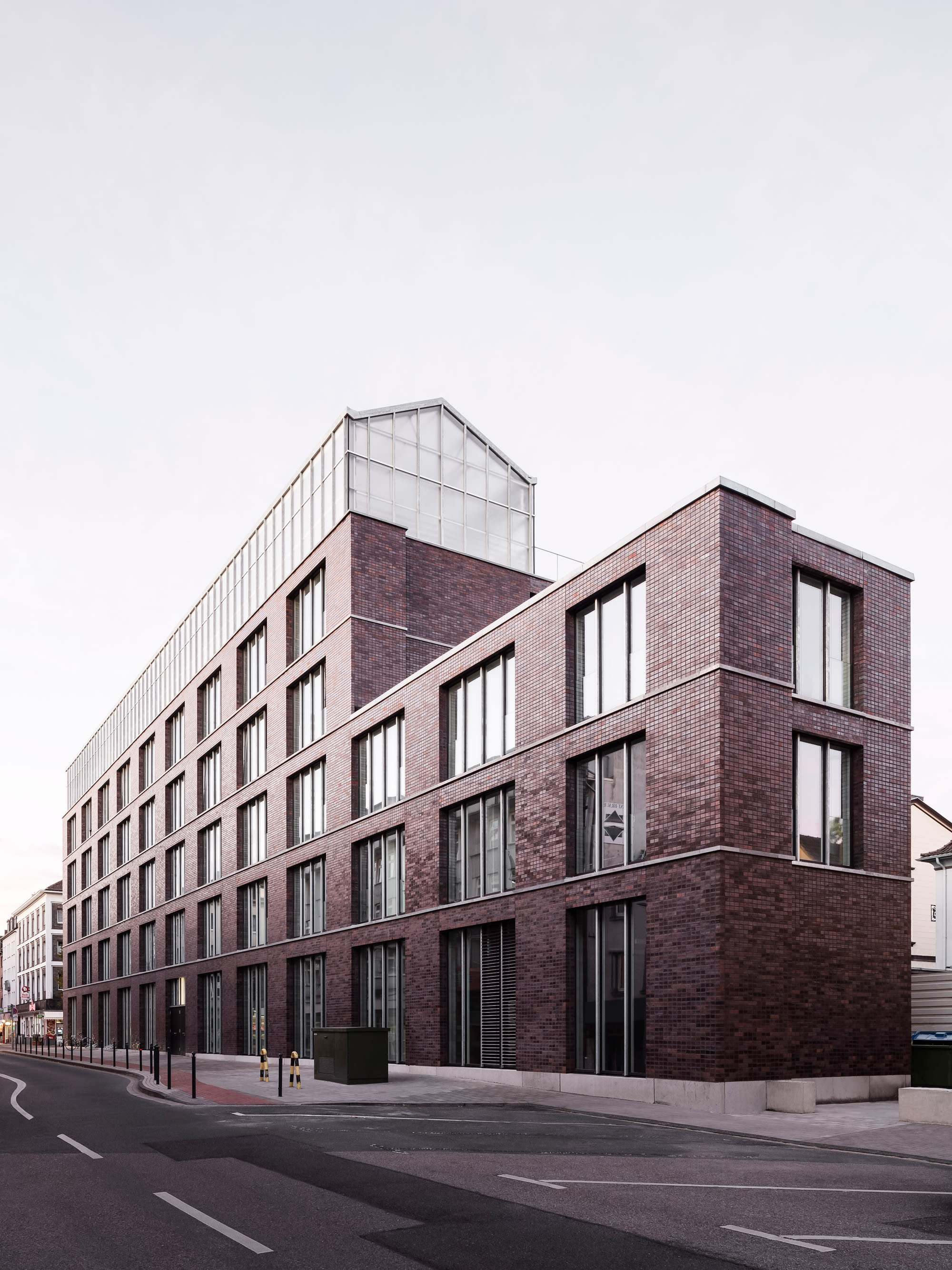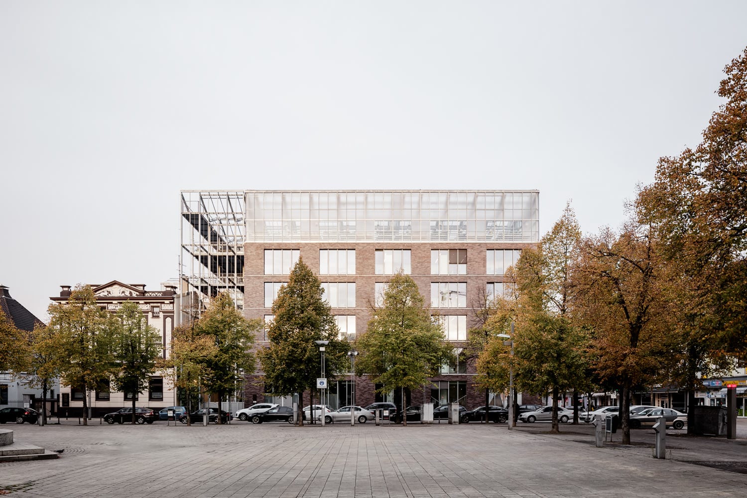 The office building in the center of Oberhausen combines the diverse functions of a public administrative building and rooftop garden in a new way, integrating features of both typologies. The tension between the physicality of the brick building and the delicate lightness of the greenhouse creates a new identity that affects the urban context of the Altmarkt, an important location in the city.