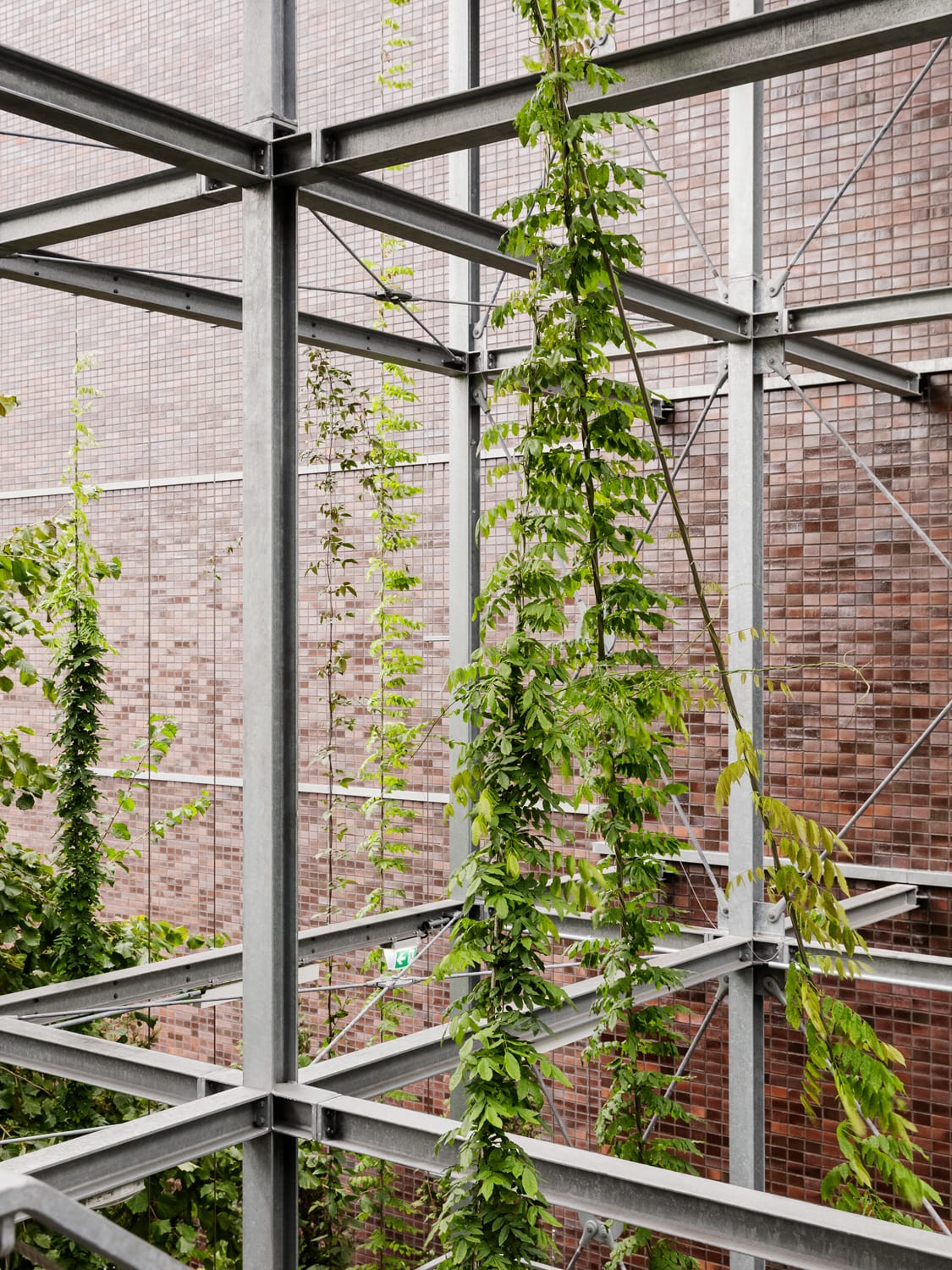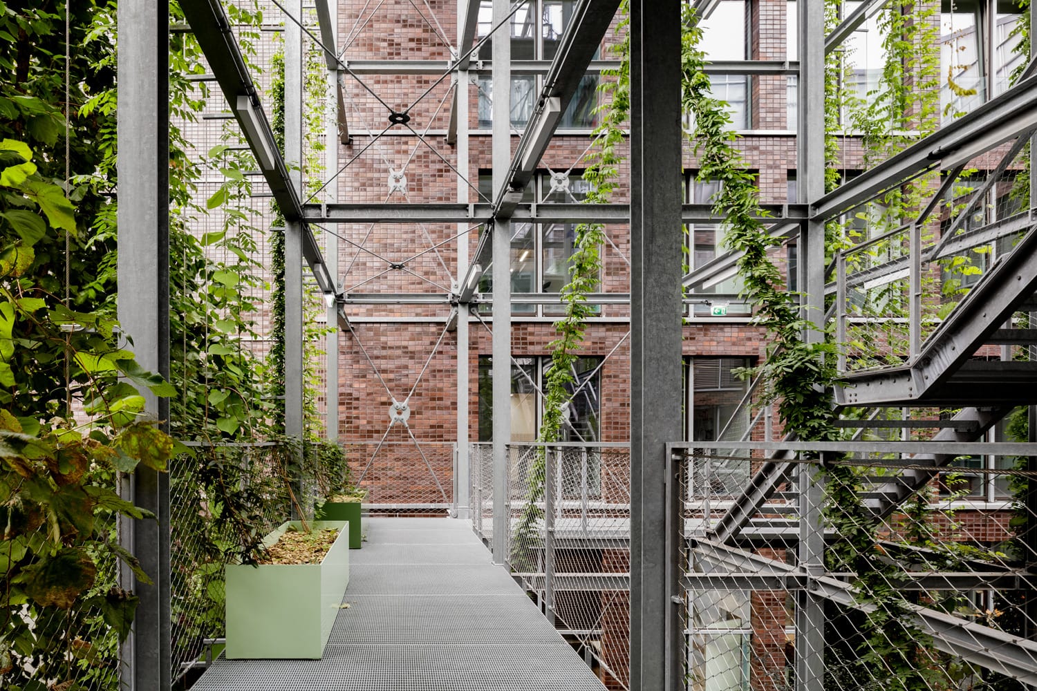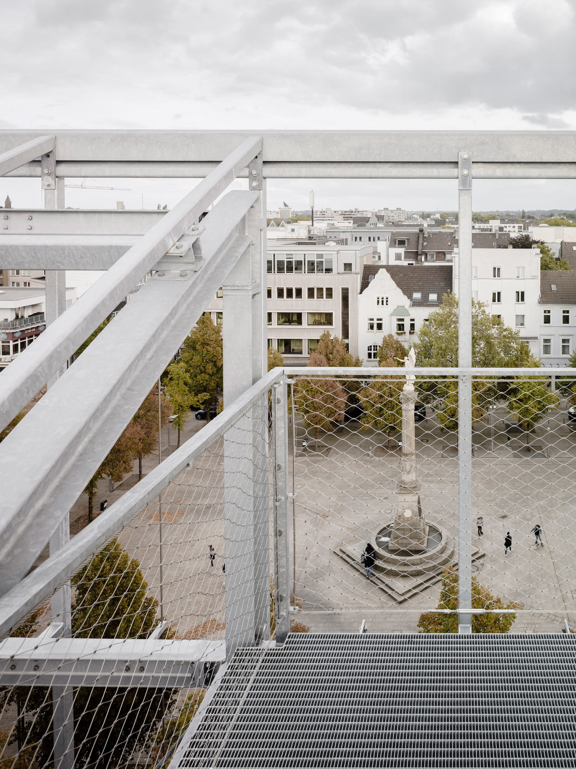 A vertical garden connects the square with the roof garden. Developed in collaboration with landscape architects atelier le balto, it is an effective urban planning element that purposefully combines the old and new landscape typologies as a public space. A varied course leads visitors from the tree-lined market square up steps and platforms, past climbing plants and seating areas, to the roof. From the rooftop, the view opens up over the historical center of the city. A part of the rooftop greenhouse which was planned in cooperation with Haas Architekten, is a research area used by the Oberhausen-based Fraunhofer Institute for Environmental, Safety and Energy Technology, to realize its concepts in the field of building-integrated agriculture.