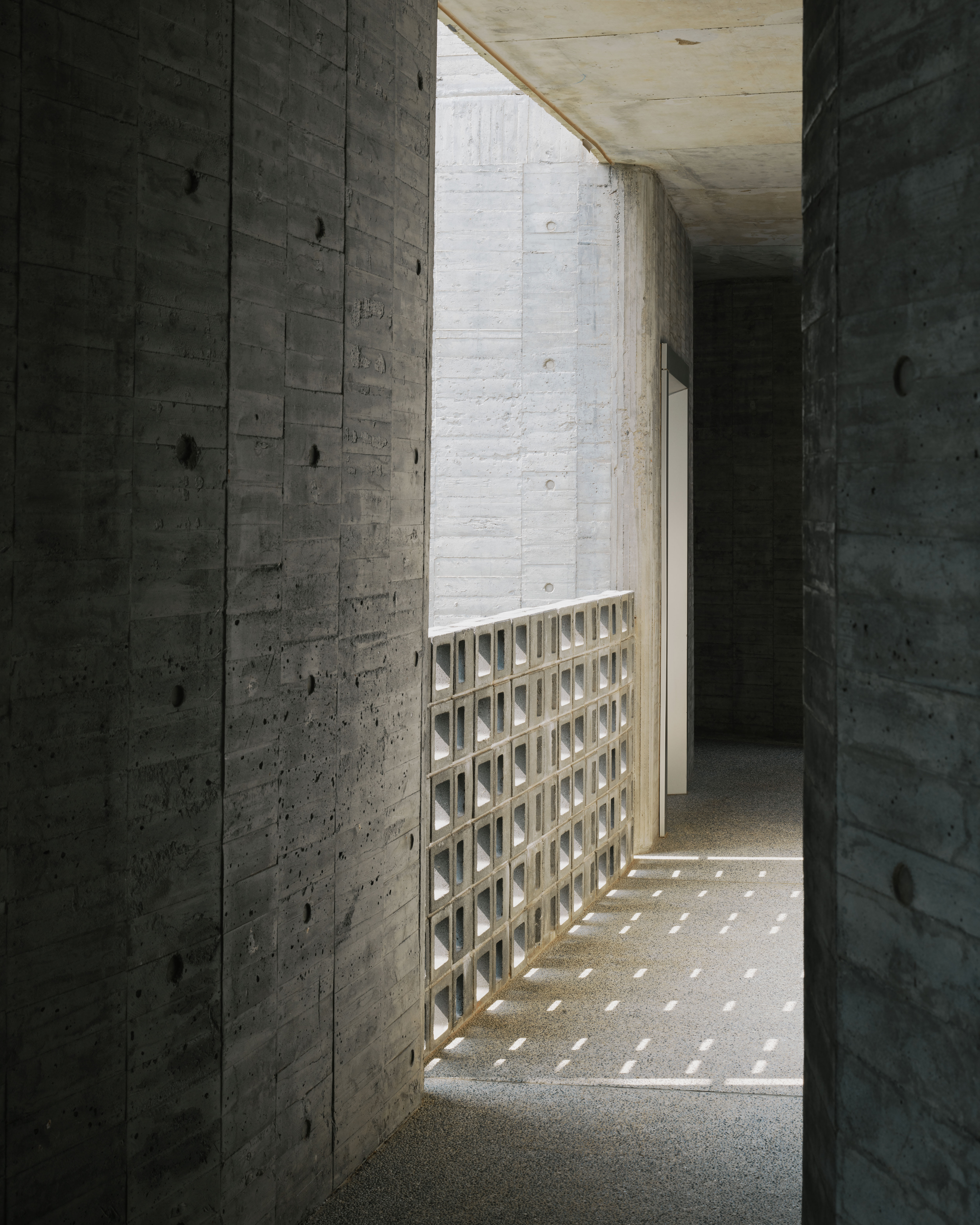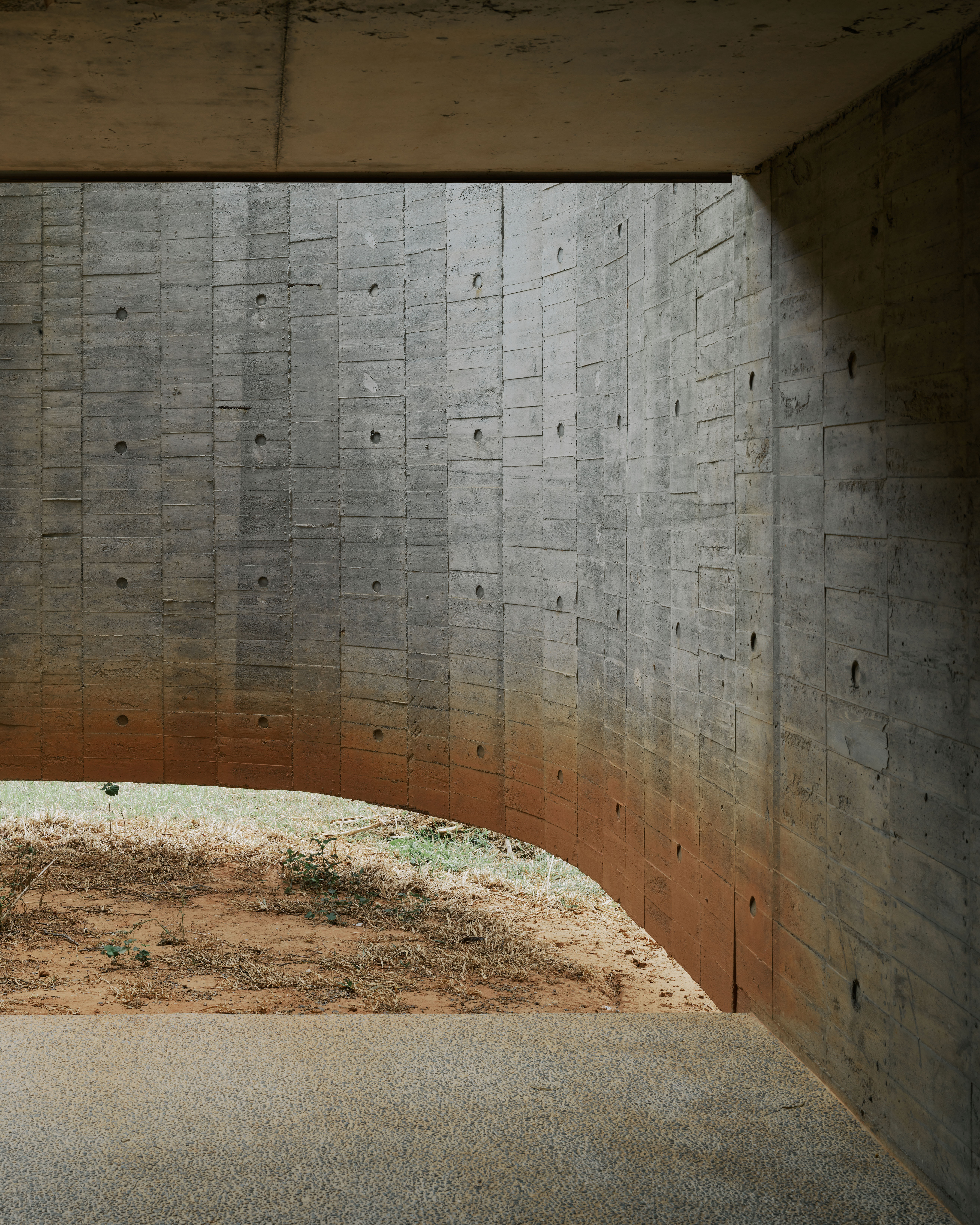 Along their entire lengths, the materiality of the curve walls transitions from rough concrete to wood, metal and tiles. Where the walls hover above ground to create courtyards, red earth stains become a part of the tactile landscape experience. On the windward side, the roughen cast textures of the walls has also gradually smoothen out due to their constant stripping by the seasonal winds.