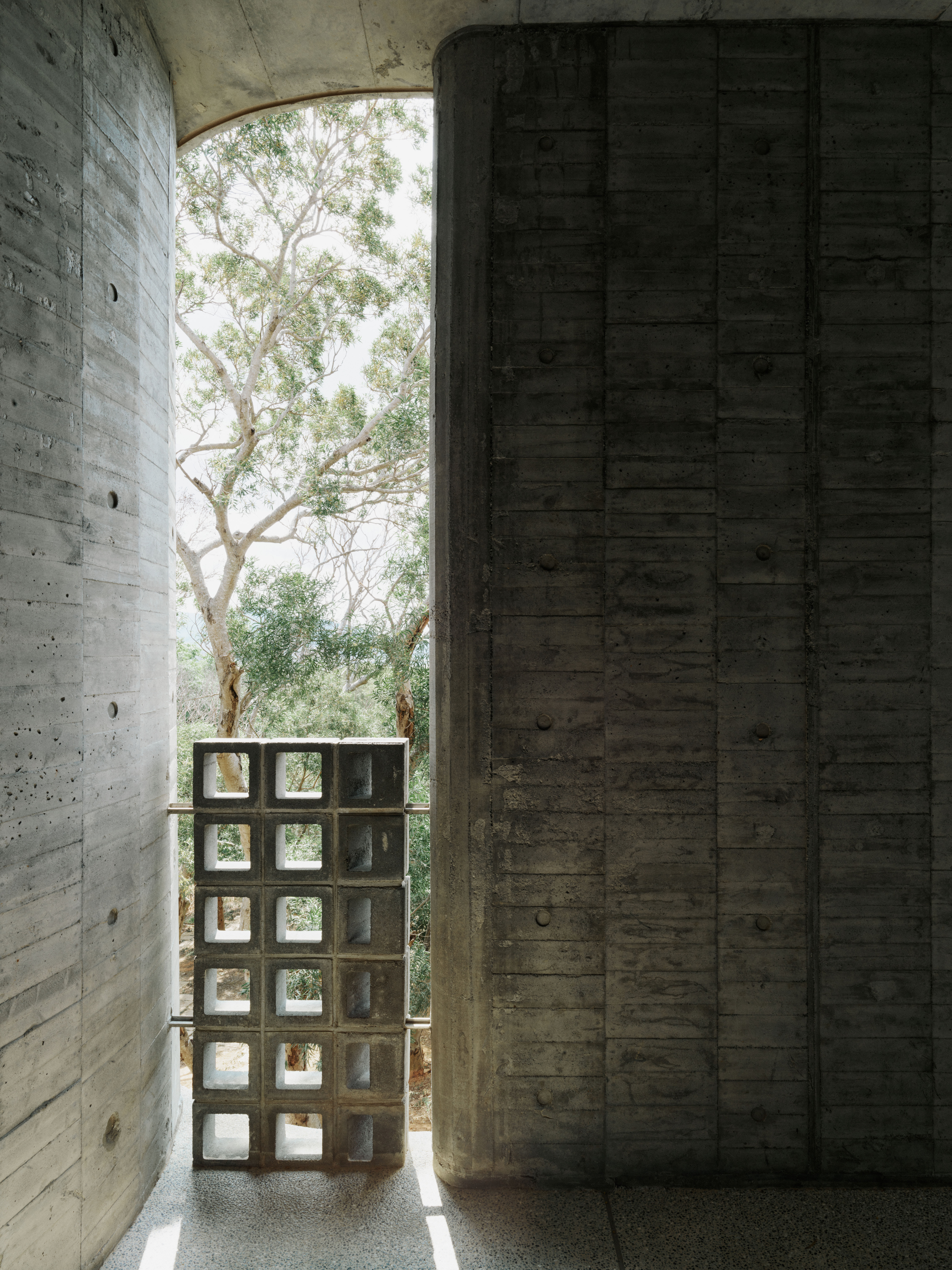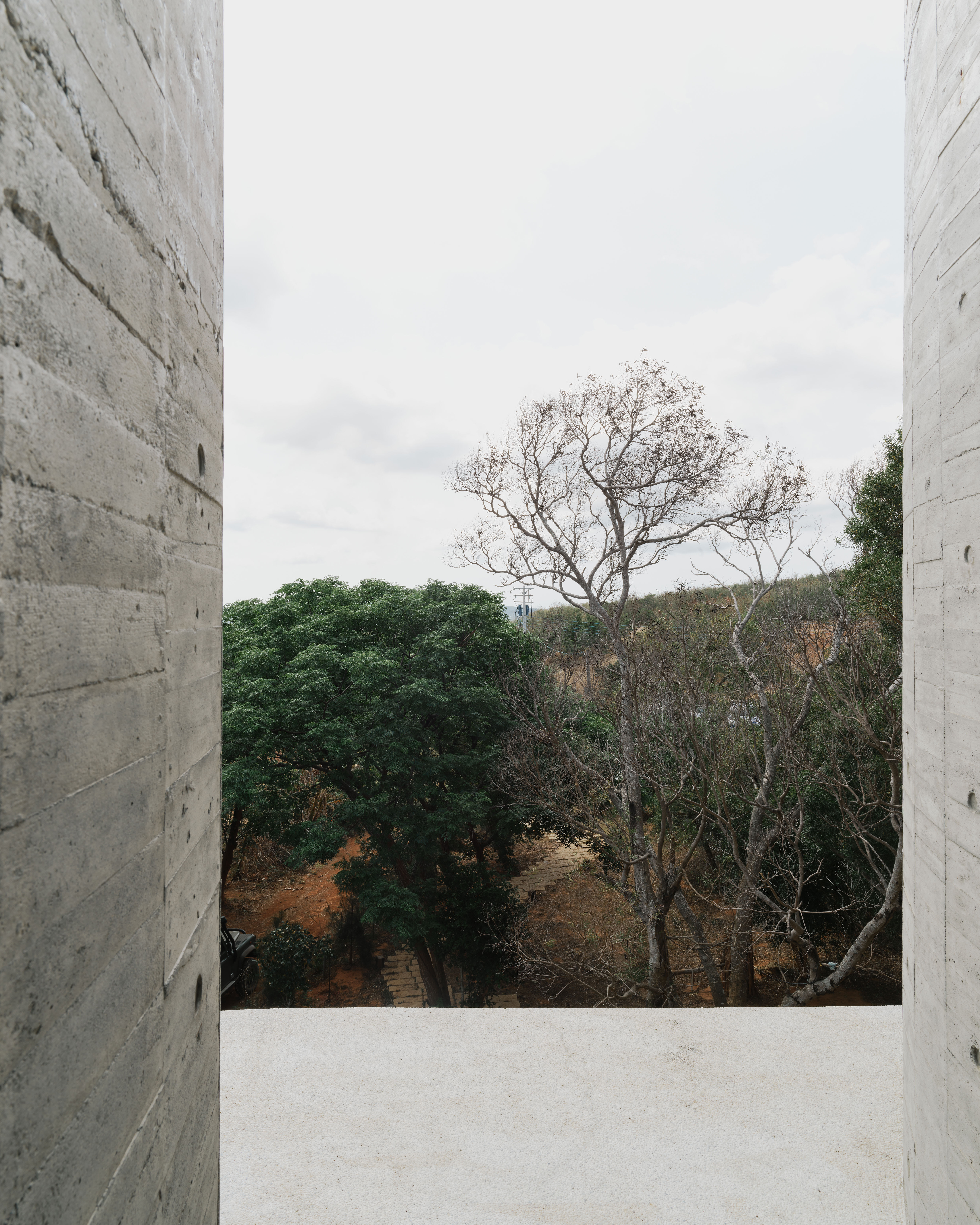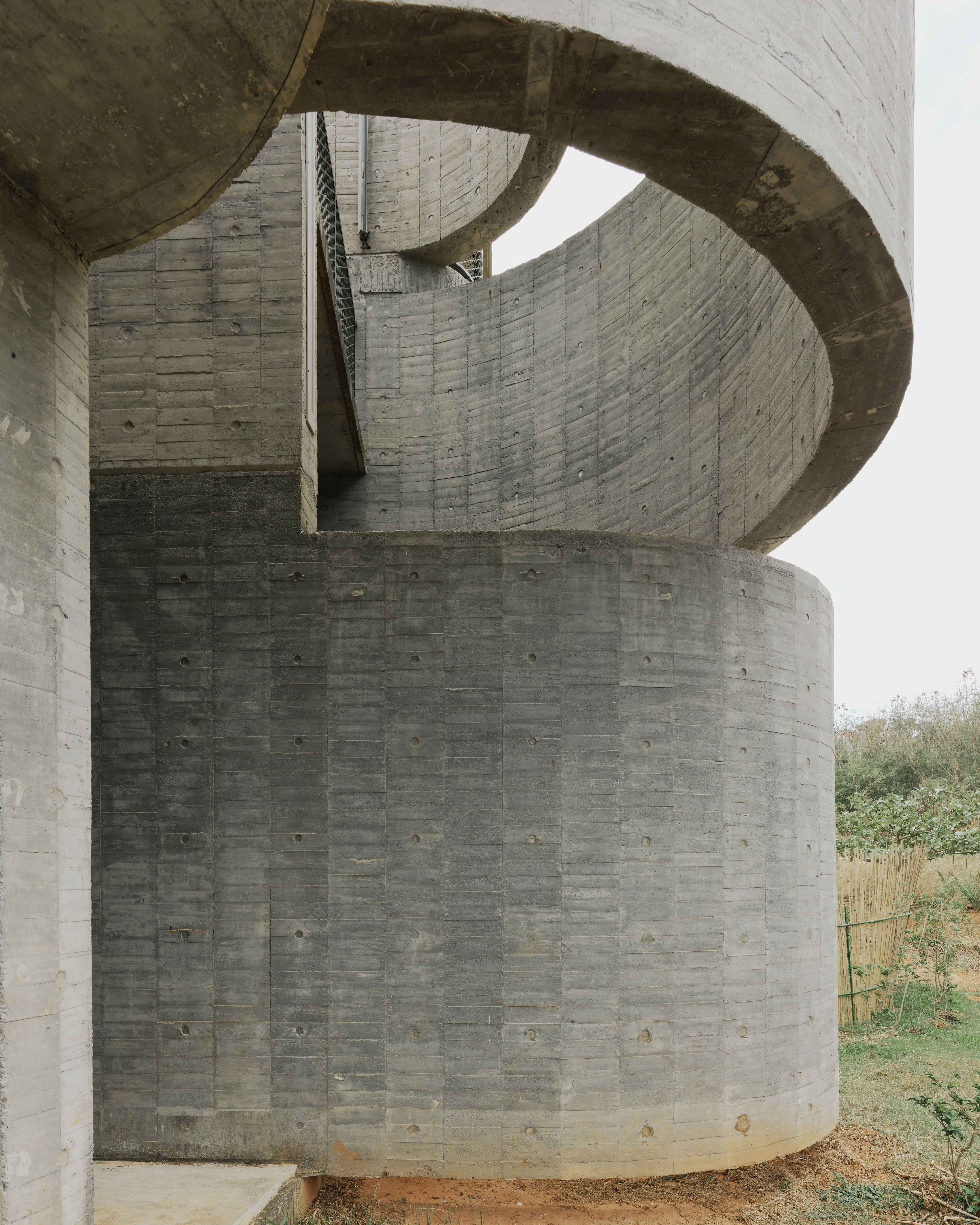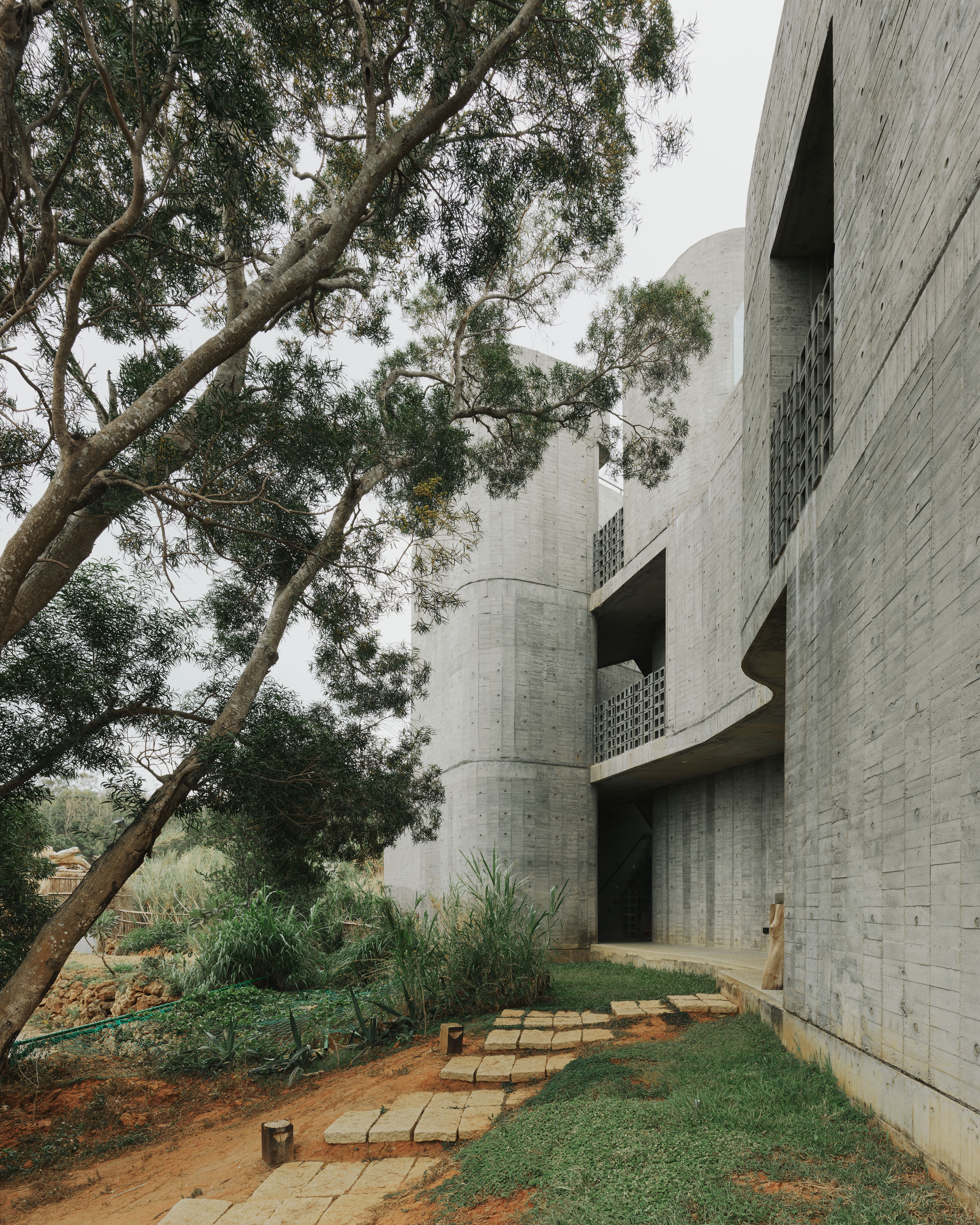 The flat slab and bearing wall structural system enables the concrete bearing walls to be misaligned vertically. The walls move in and out of the 3 floor independently, dictated by room layouts, views and the placements of wind barriers. At the stairs, curve walls hover over each other to reveal the horizon at the juncture of the sky, forest and ocean. The walls fly 4.5m off the 2F and 3F floor plates to form a vertical suspended enclosure, an echo chamber of sorts where the sound of acacia leaves rustling in the strong ocean winds is amplified. On the ground floor, the walls cantilever off the floor slab to form courtyards. Local formwork made of recycled or rough low grade wood were used, 30cm wide panels for bigger curves, 20cm for tighter curves and 4cm batons for sharp curves. The highly tolerant formwork system allows for misalignments and mistakes made by the local workers, which created the signature “lo-res” curves throughout.