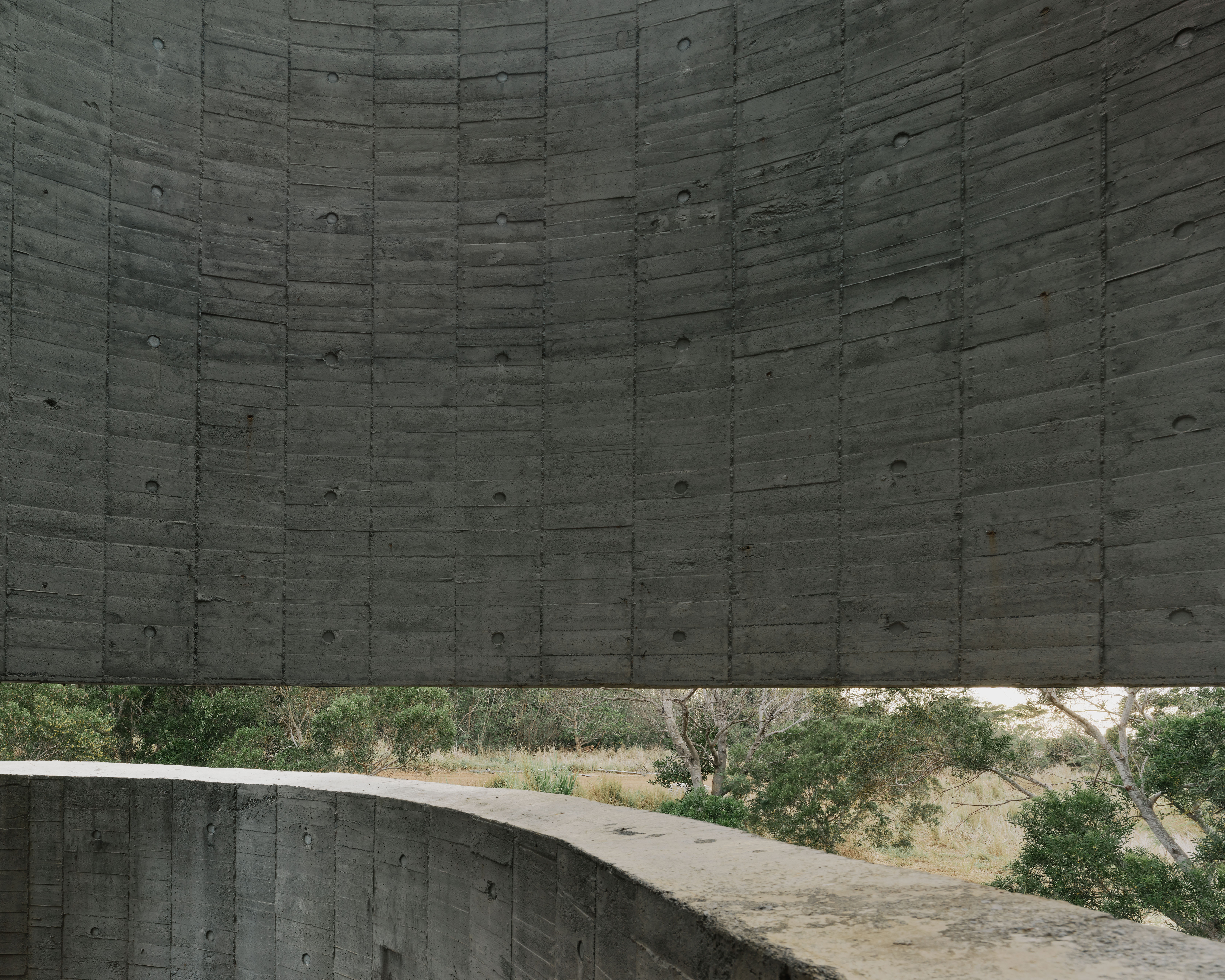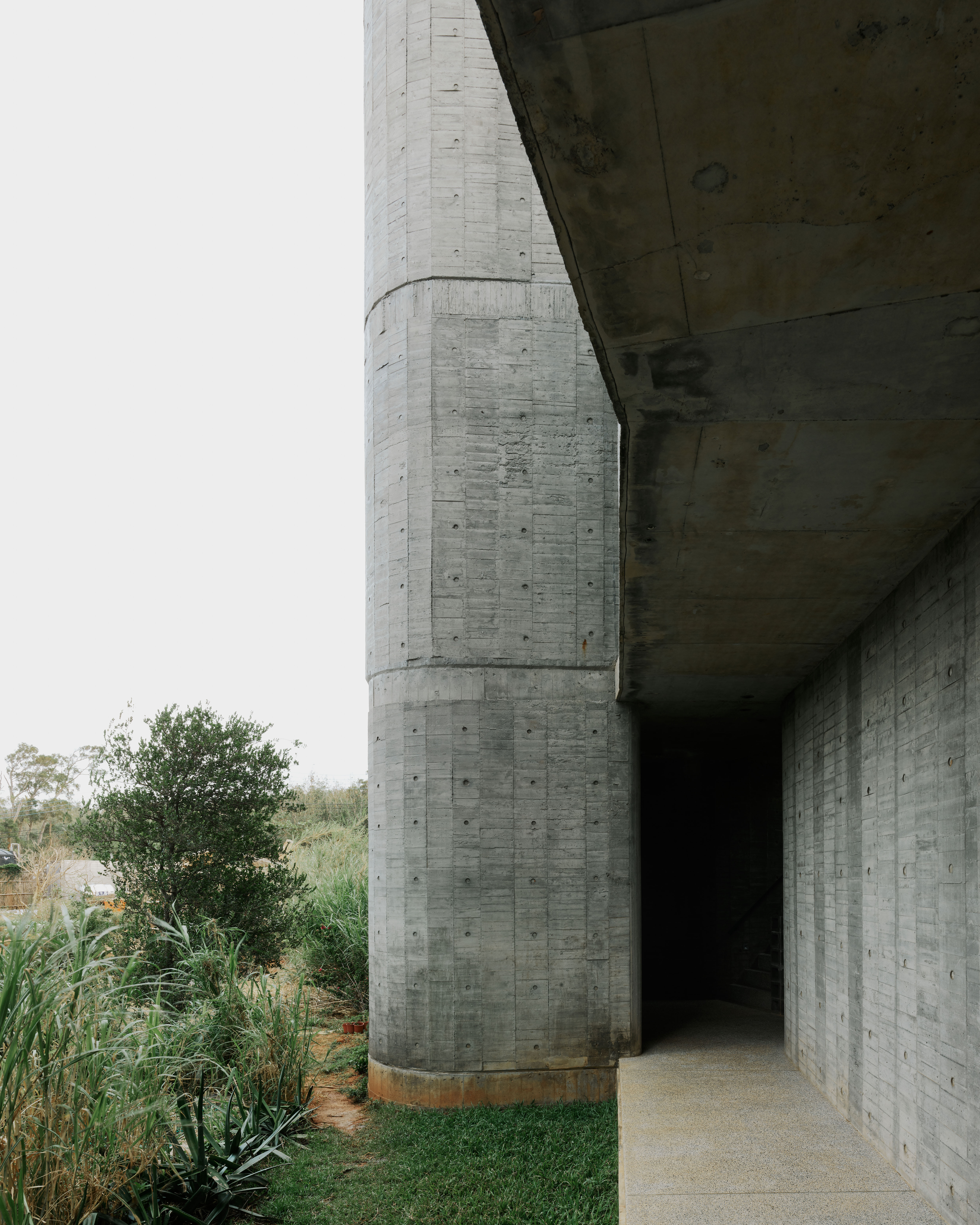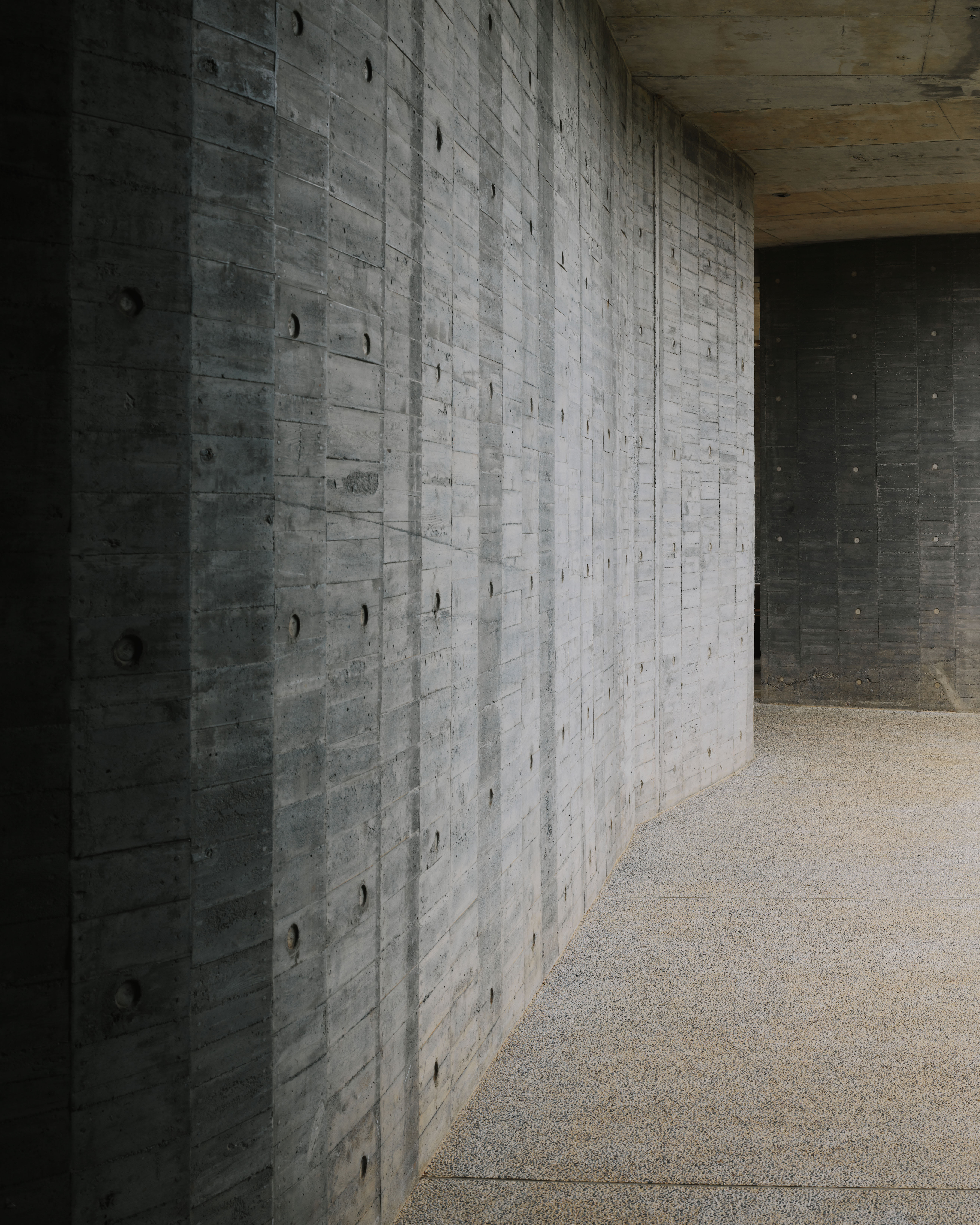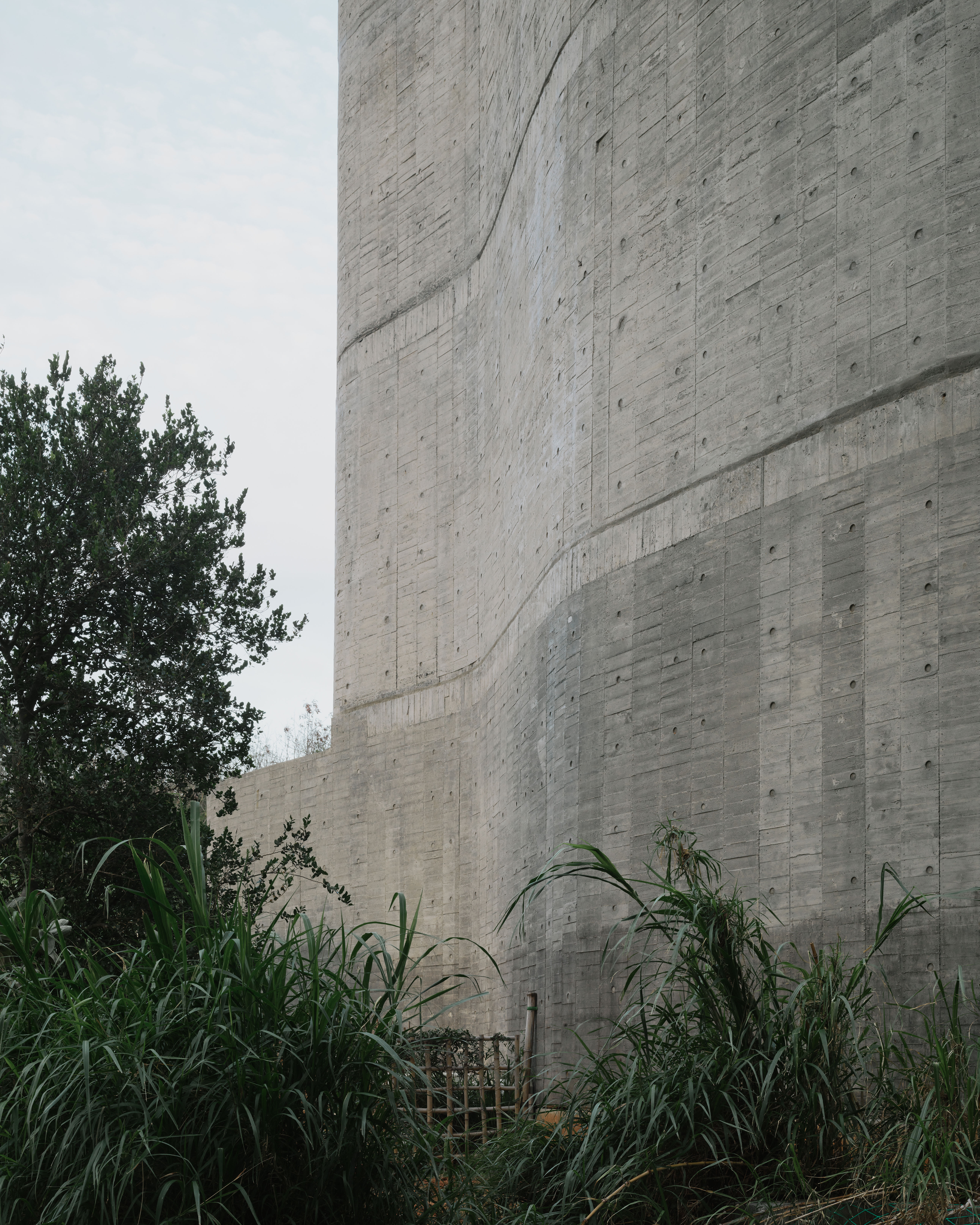 The flat slab and bearing wall structural system enables the concrete bearing walls to be misaligned vertically. The walls move in and out of the 3 floor independently, dictated by room layouts, views and the placements of wind barriers. At the stairs, curve walls hover over each other to reveal the horizon at the juncture of the sky, forest and ocean. The walls fly 4.5m off the 2F and 3F floor plates to form a vertical suspended enclosure, an echo chamber of sorts where the sound of acacia leaves rustling in the strong ocean winds is amplified. On the ground floor, the walls cantilever off the floor slab to form courtyards. Local formwork made of recycled or rough low grade wood were used, 30cm wide panels for bigger curves, 20cm for tighter curves and 4cm batons for sharp curves. The highly tolerant formwork system allows for misalignments and mistakes made by the local workers, which created the signature “lo-res” curves throughout.