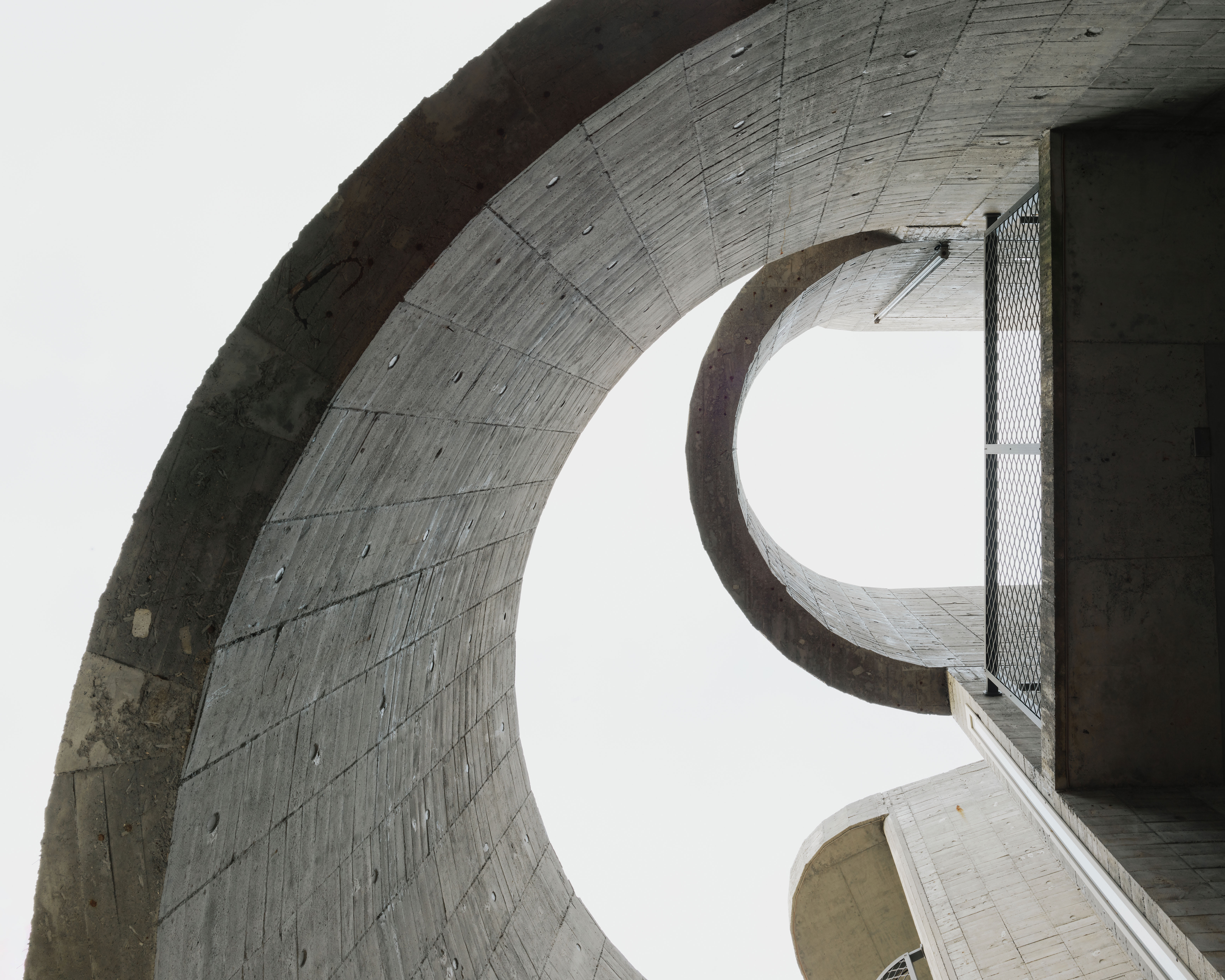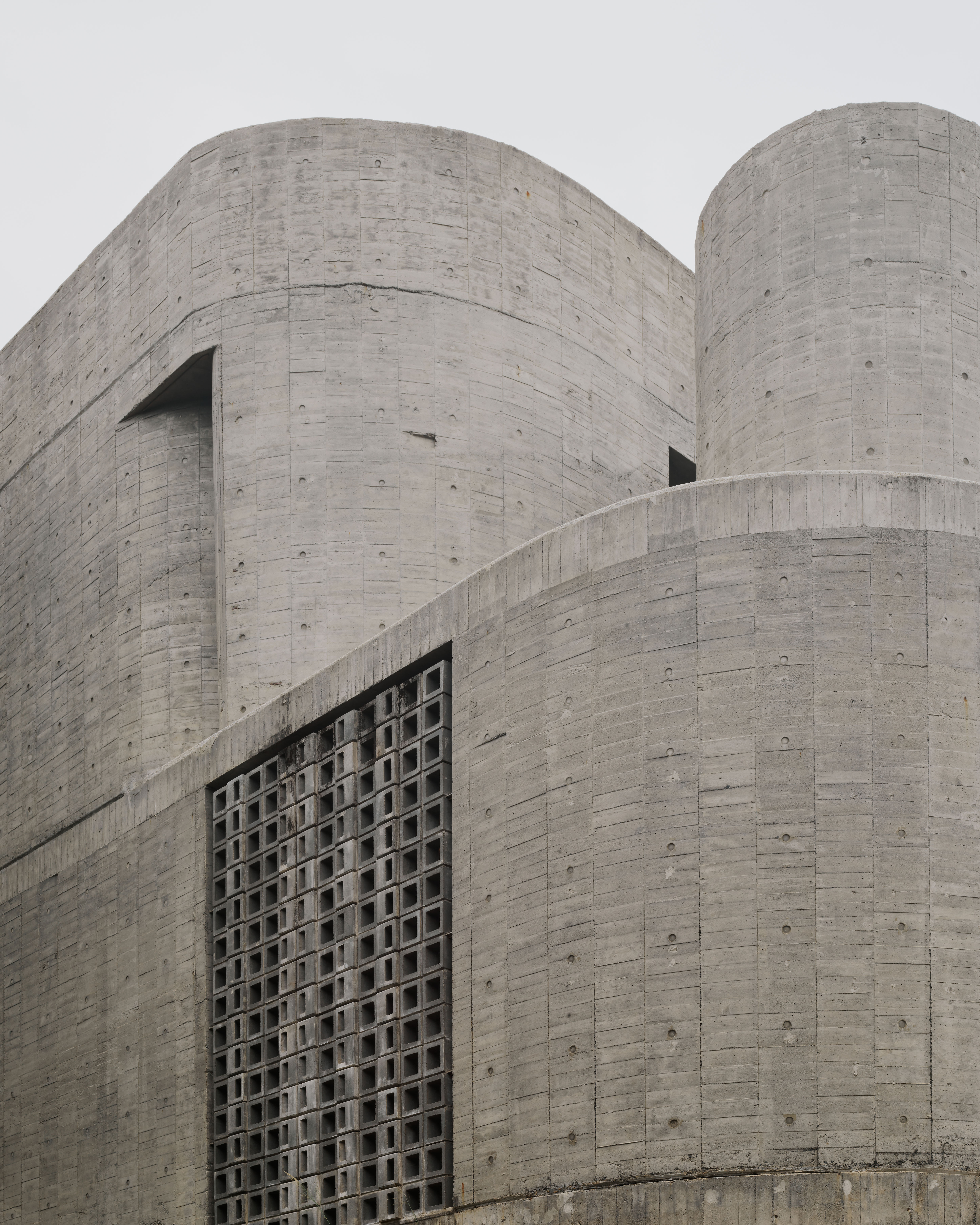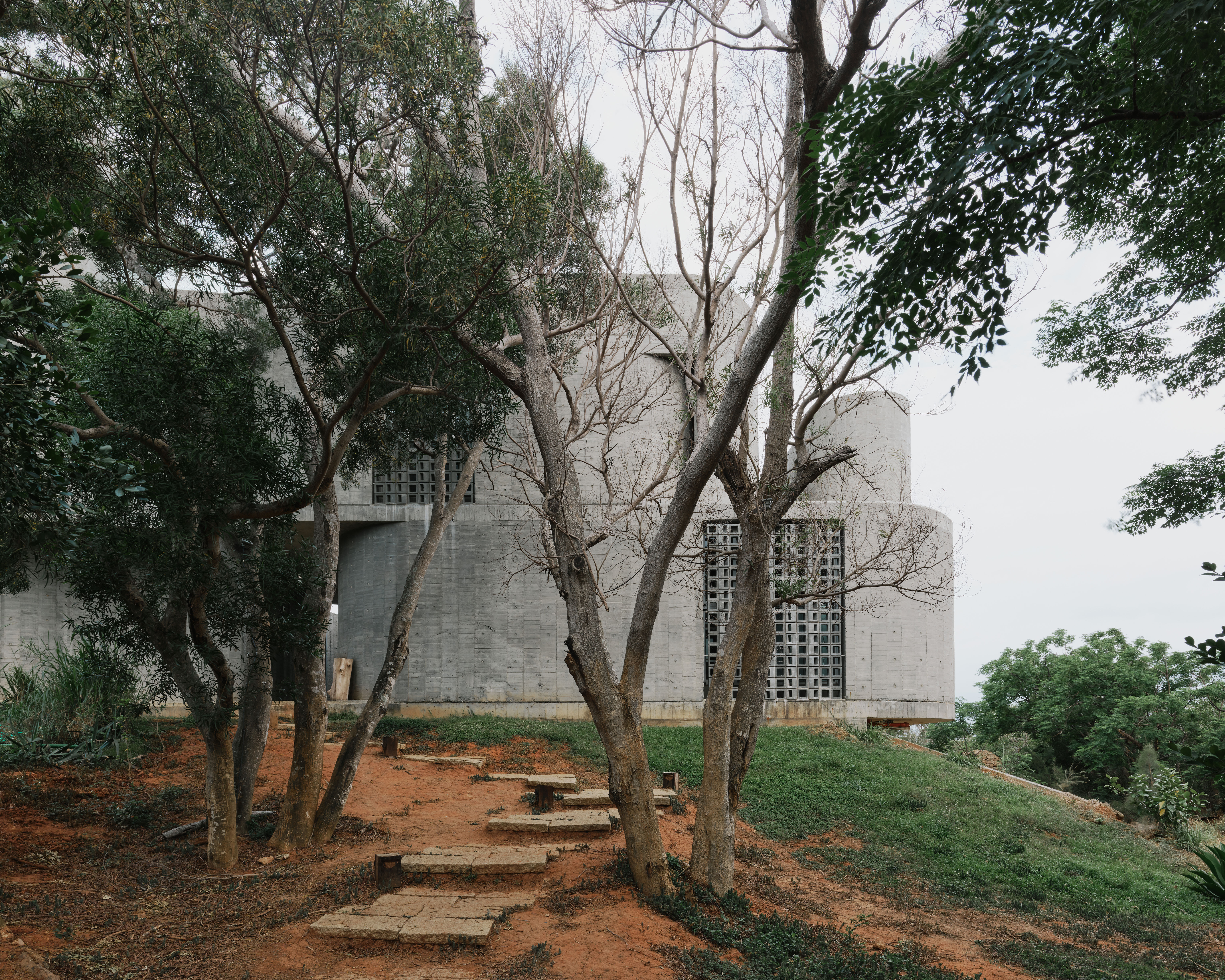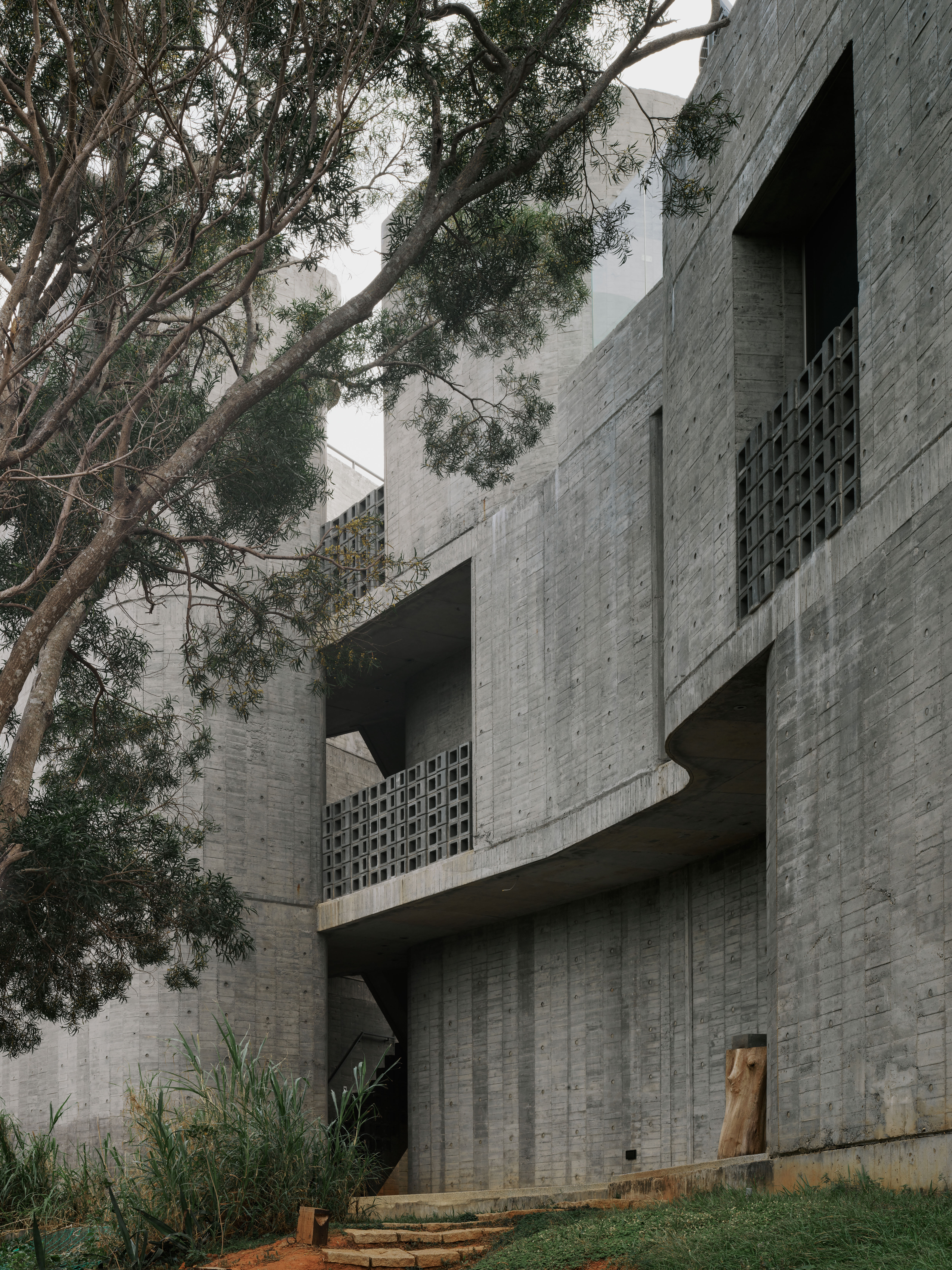 The flat slab and bearing wall structural system enables the concrete bearing walls to be misaligned vertically. The walls move in and out of the 3 floor independently, dictated by room layouts, views and the placements of wind barriers. At the stairs, curve walls hover over each other to reveal the horizon at the juncture of the sky, forest and ocean. The walls fly 4.5m off the 2F and 3F floor plates to form a vertical suspended enclosure, an echo chamber of sorts where the sound of acacia leaves rustling in the strong ocean winds is amplified. On the ground floor, the walls cantilever off the floor slab to form courtyards. Local formwork made of recycled or rough low grade wood were used, 30cm wide panels for bigger curves, 20cm for tighter curves and 4cm batons for sharp curves. The highly tolerant formwork system allows for misalignments and mistakes made by the local workers, which created the signature “lo-res” curves throughout.