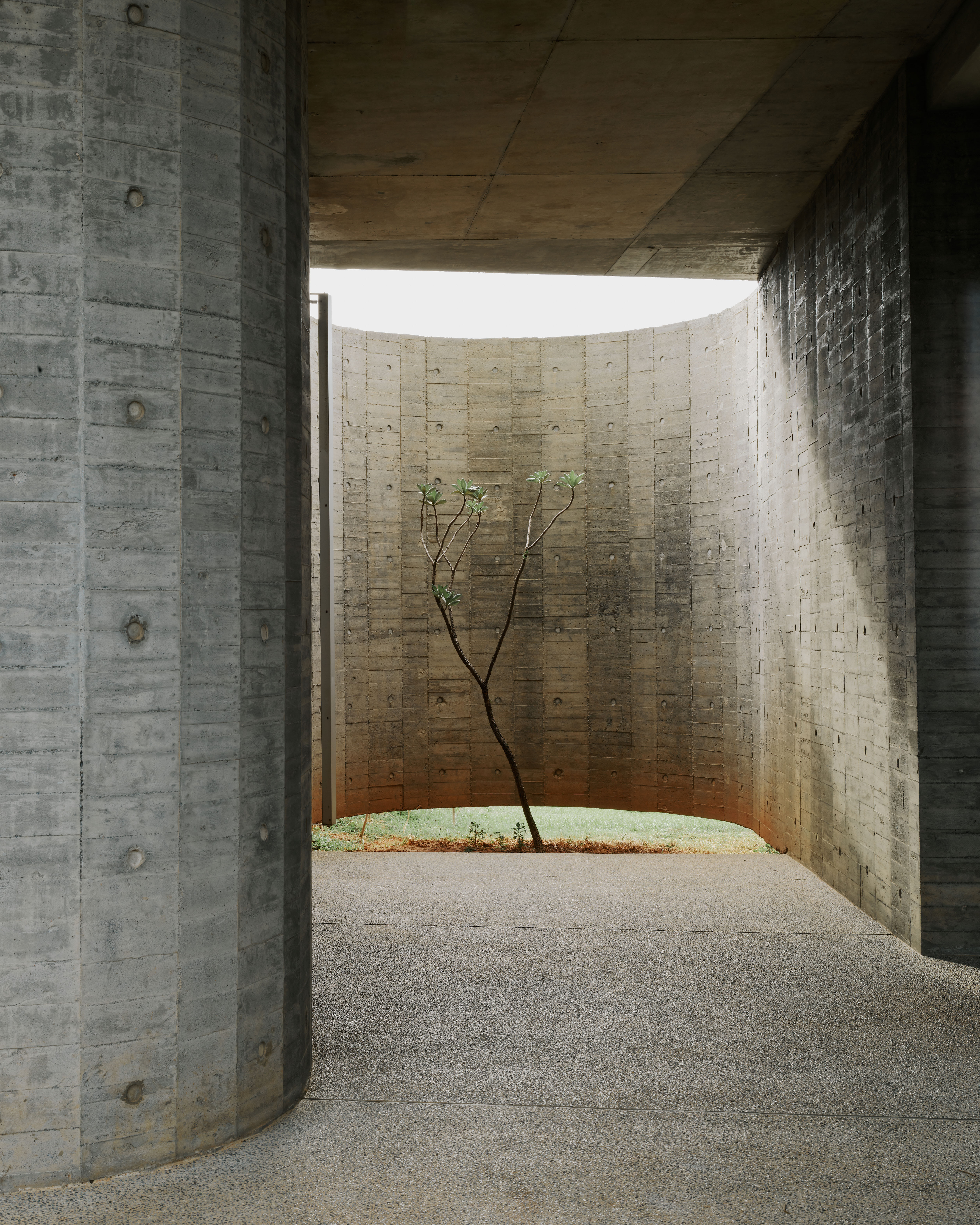 Inspired by the raw beauty of the natural surroundings, the design concept seeks to create a sense of quietude and permanence with a single architectural element and a minimal palette of materials; defining the entire architecture with just curves walls that are both structure and form, inside and outside, exterior and interior all at once.