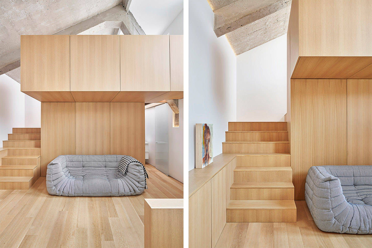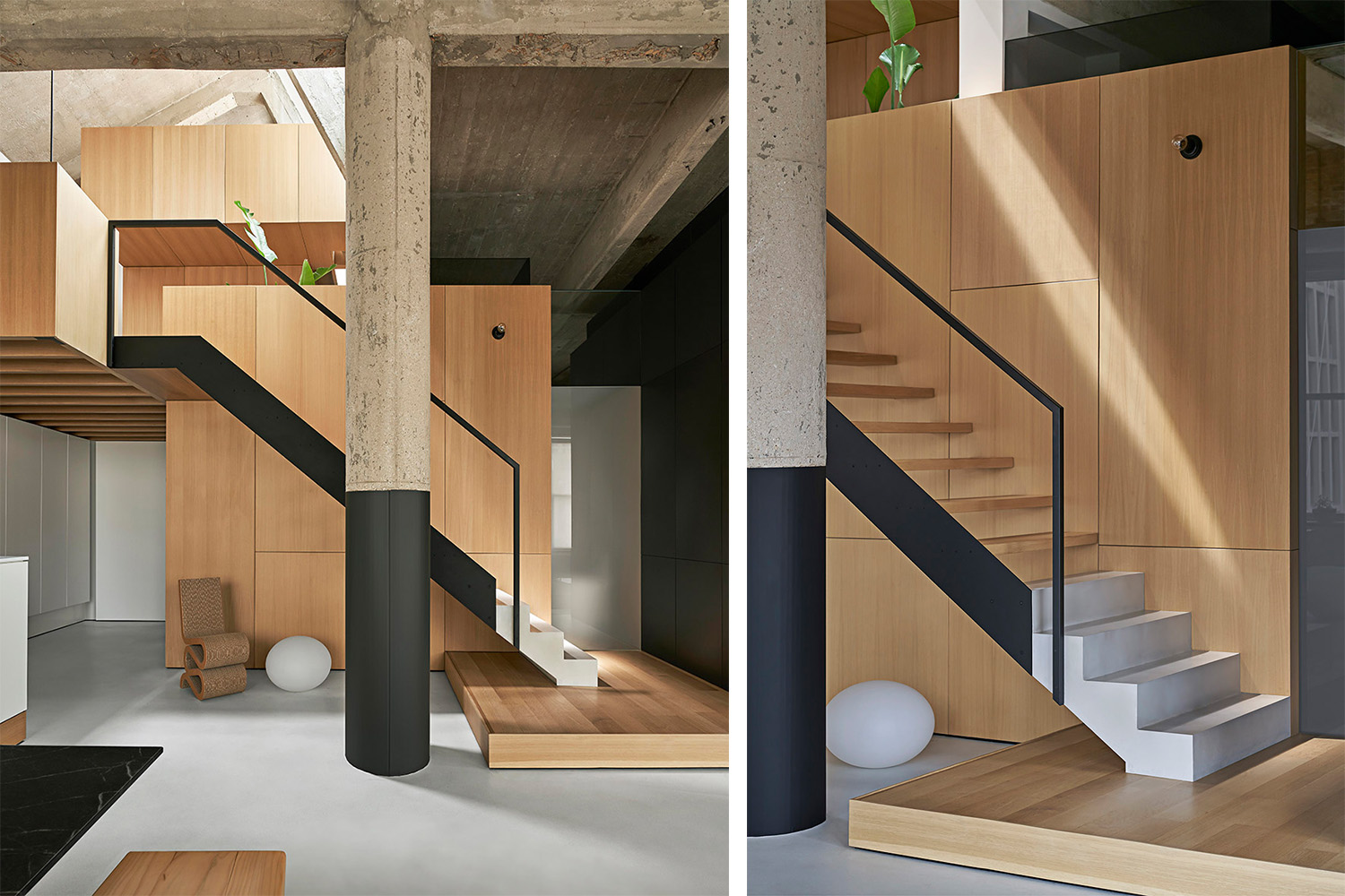 该项目位于一栋世纪老建筑内部,设计团队将一套功能性极差的住宅翻修成了全新的家庭空间。在解决体量内部复杂的空间问题时,设计师精心构建了一个可以点亮生活灵感、彻底放松身心的生活环境。在曾经作为厂房的空间内部,被木材覆盖的低矮的过渡区使人在进入住宅时首先感受到一种浓厚的工业气息。设计师通过标准的结构部件、材料约束和灯光设计,在弱化了整体空间主导性的同时,还保持了空间结构的开放和清晰。