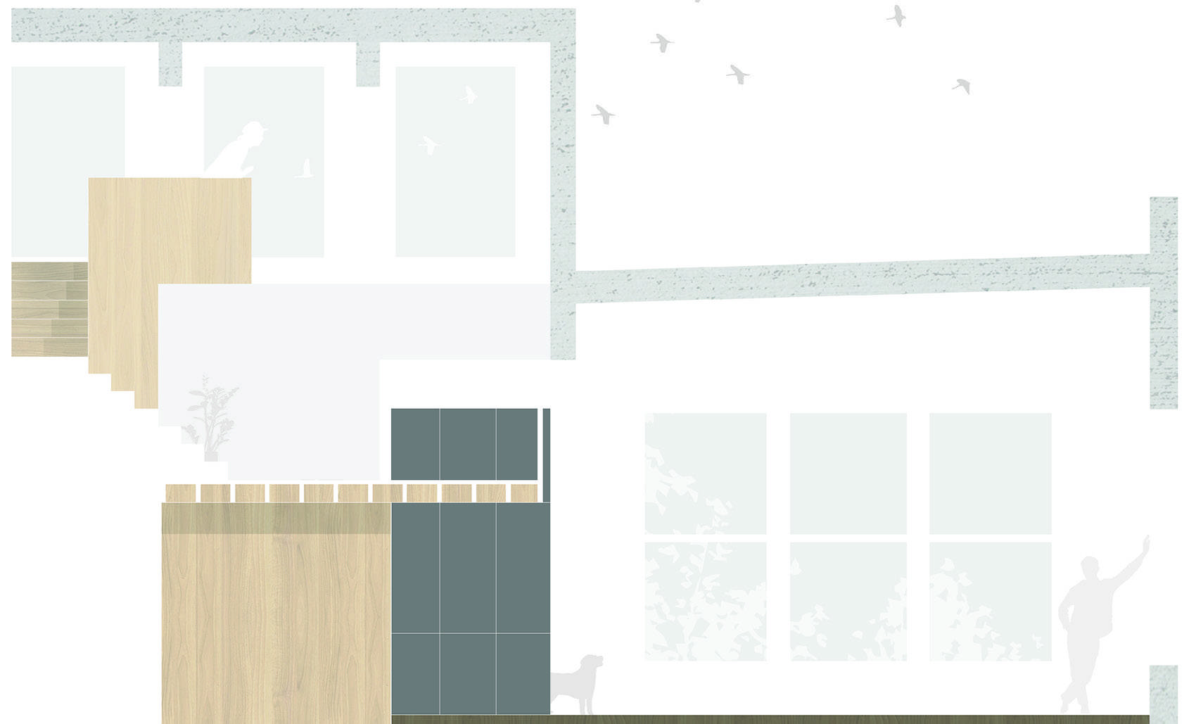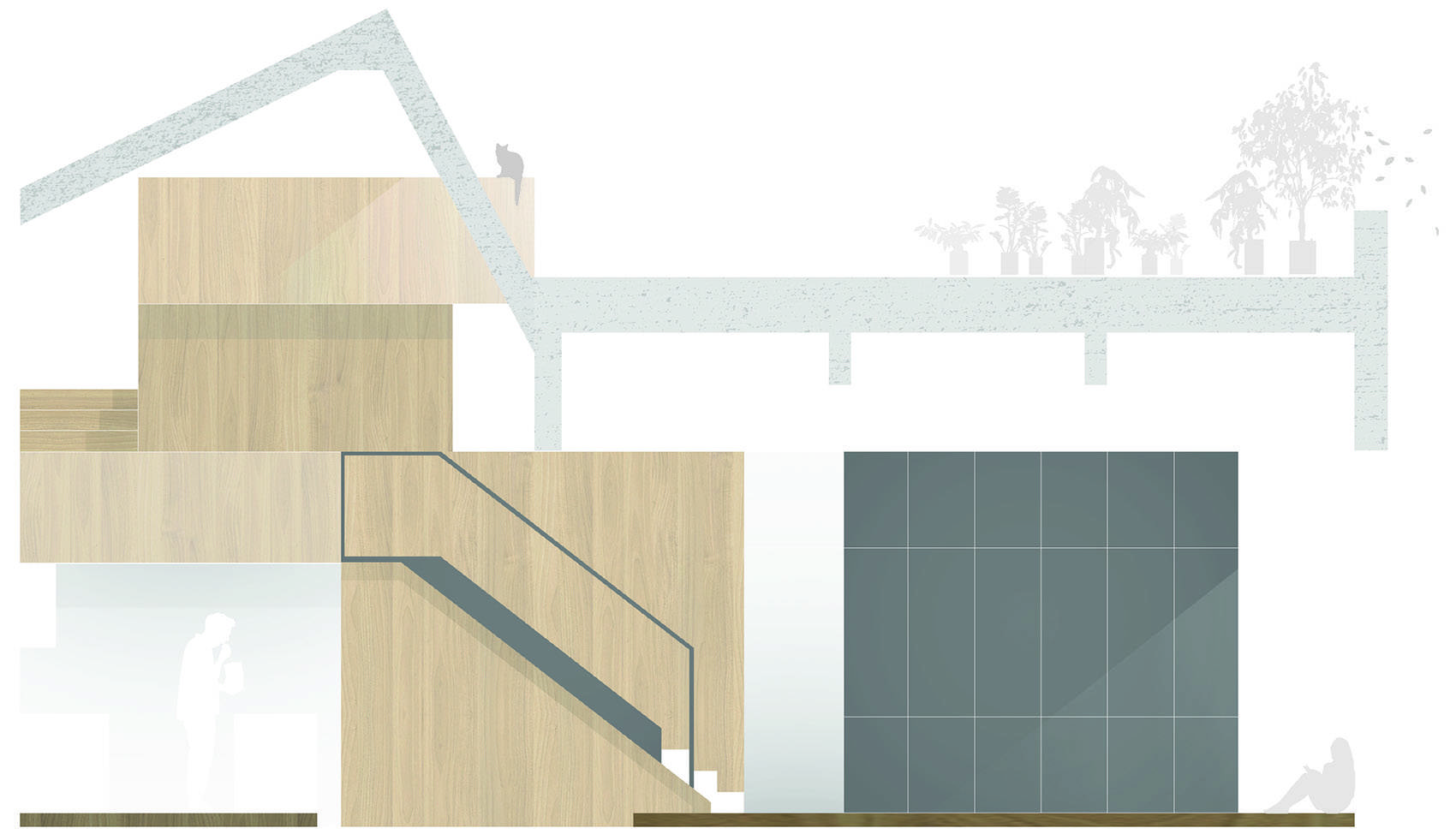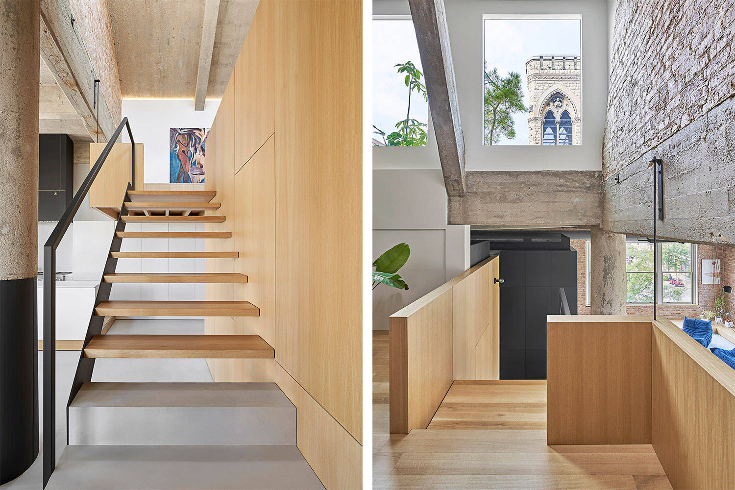 当居住者在不楼层间活动时,会有各种意想不到的绝佳视角显现出来。上层空间主要作为住户的休息空间和工作区域,使开放的生活在一天中既分离又连接。在上层阁楼,混凝土天花板仿佛触手可及。一扇大门径直通向户外花园,在那里可以看到芝加哥市宏伟的天际线。