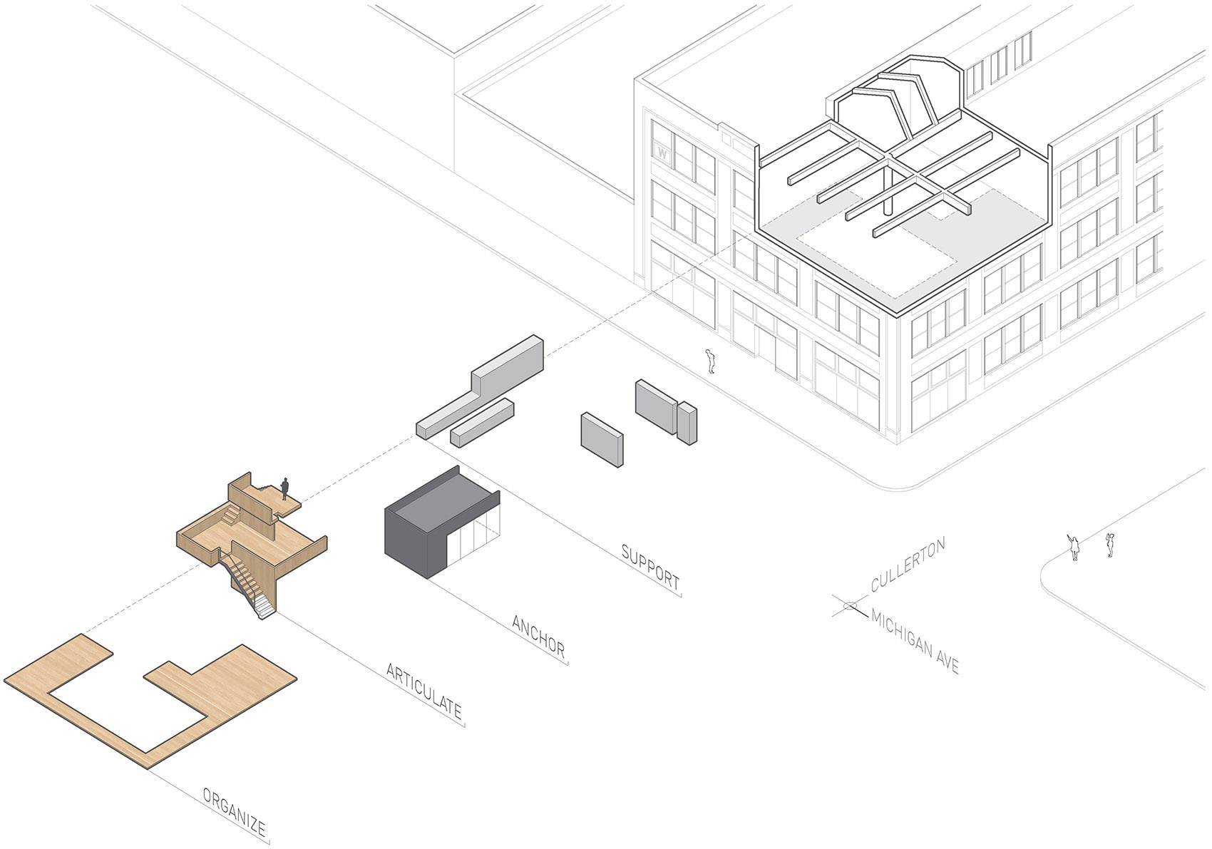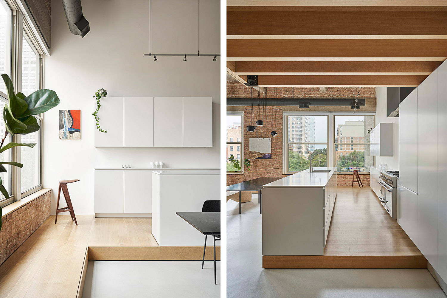 洗衣机、各种家电和储物空间被整合在嵌入式橱柜,也战略性地分散在整个空间中。开放式厨房整体高于地面,给人带来良好膳食体验的同时,还能坐拥密歇根大道的绝美景观。连续的木质平台完美适应了开放式客厅的宽阔敞亮,为更加私密的家具布置提供了可依靠的边缘,也可以放置一些住户精心挑选的绿植和装饰物。