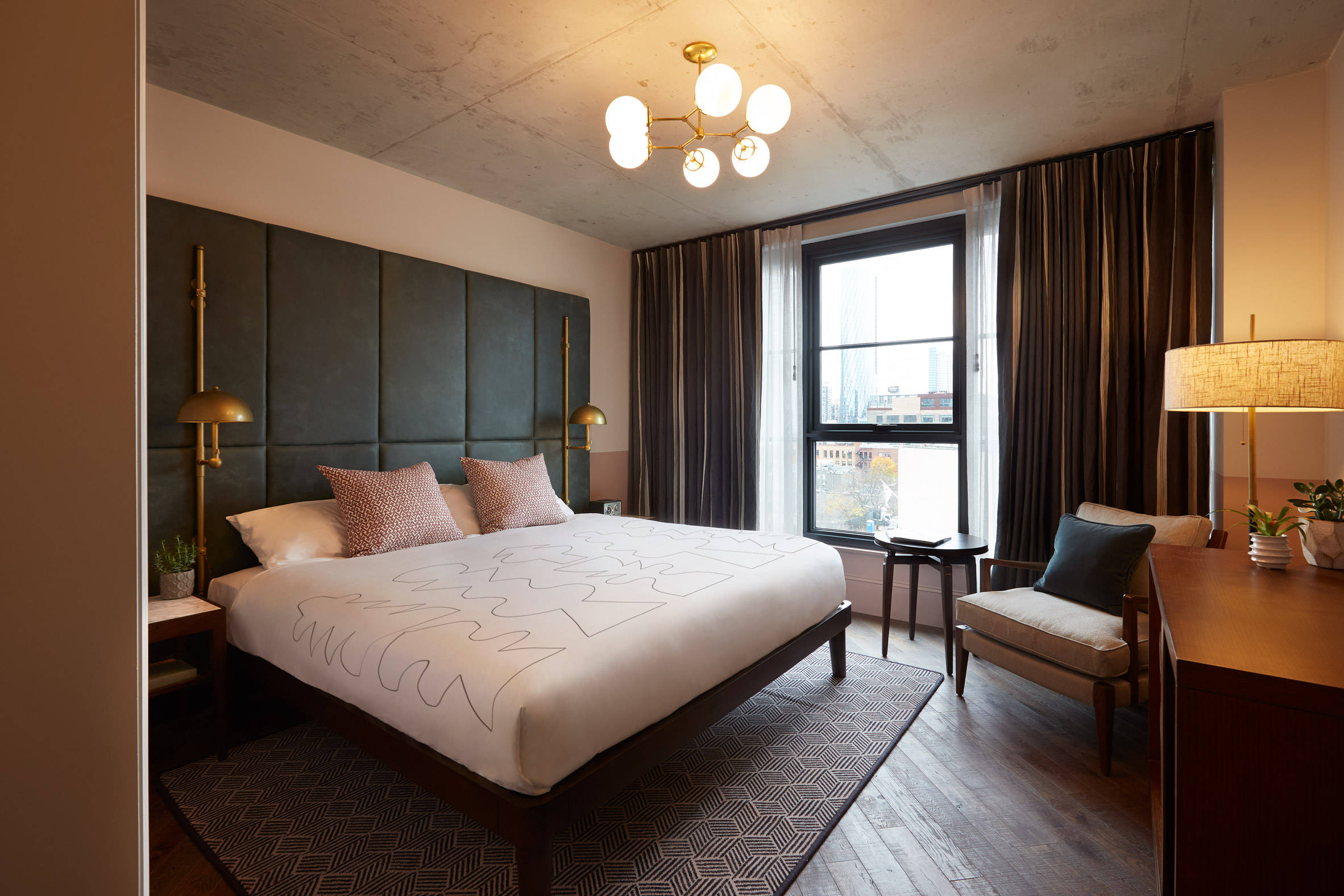 该团队为中世纪的家具,黄铜床灯和高大的皮革床头板以及芝加哥艺术家Cody Hudson设计的定制地毯和床上用品注入了住宅舒适感。Ennismore Design Studio还与Johalla Projects的当地画廊主人Anna Cerniglia合作策划了一系列艺术作品,这些艺术作品将突出“芝加哥艺术界的创造性影响力”。从客房到公共区域,整个酒店都放置了350多个独立主题的混合媒体作品,从平版印刷到丝网印刷。