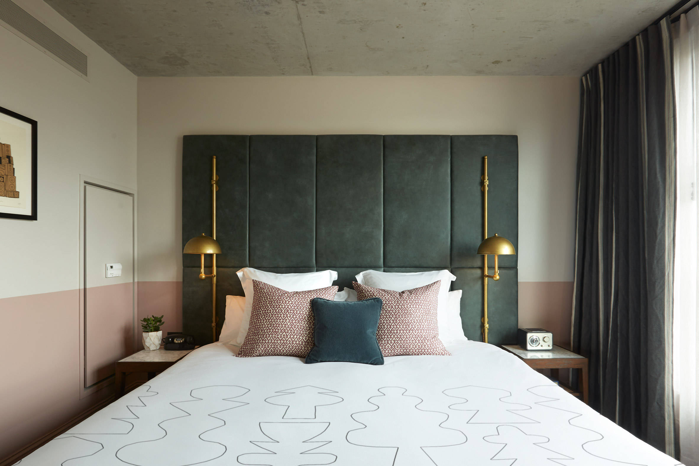 Hoxton Chicago拥有该品牌首个屋顶游泳池,健康工作室和一个两层楼的大堂,为非客人提供一个共用空间。Ennismore的内部设计团队负责监督新酒店的室内装饰。它塑造了182间客房,配有混凝土天花板和“仓库式”窗户,暗示了该地区的工业历史。双色的白色和柔和的玫瑰墙增添了微妙的温暖。
