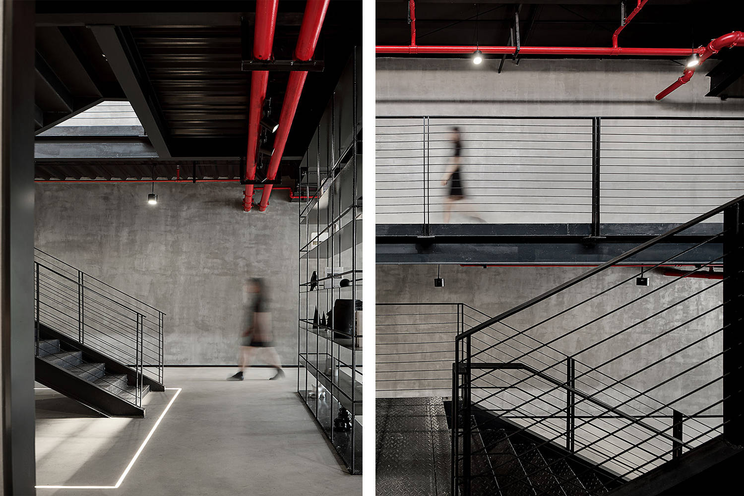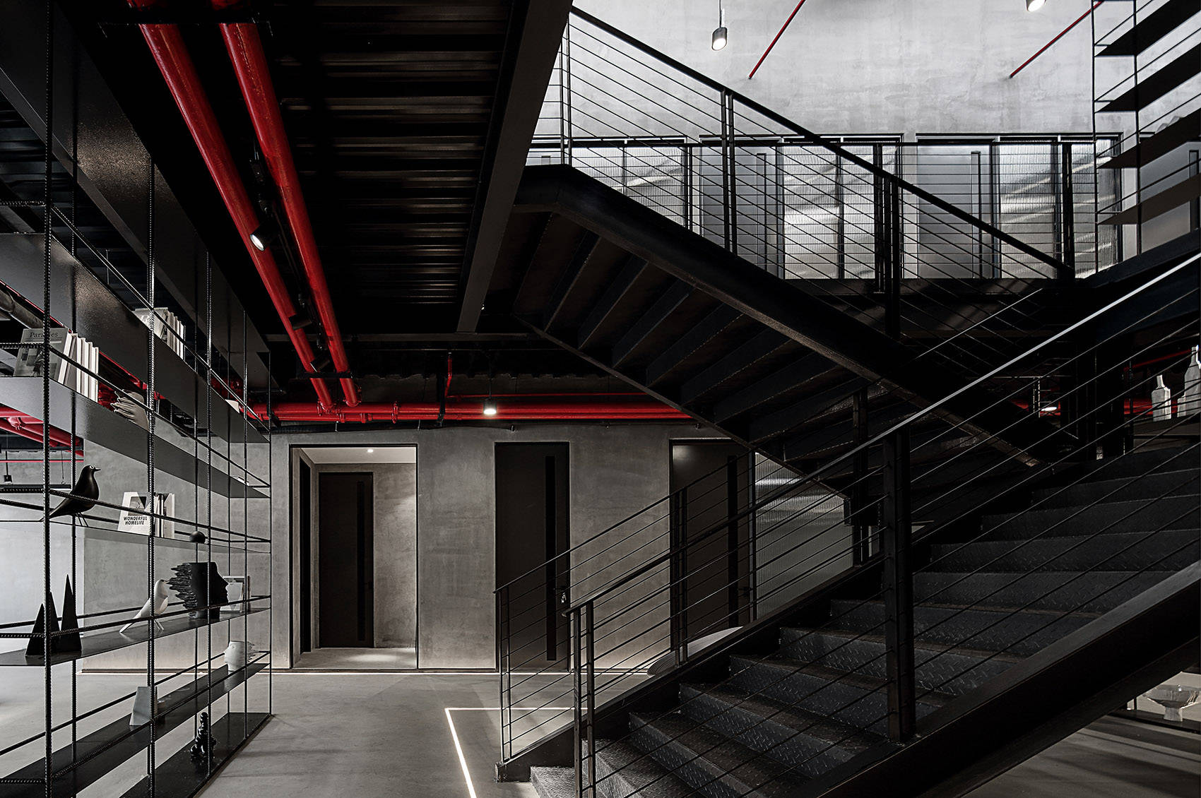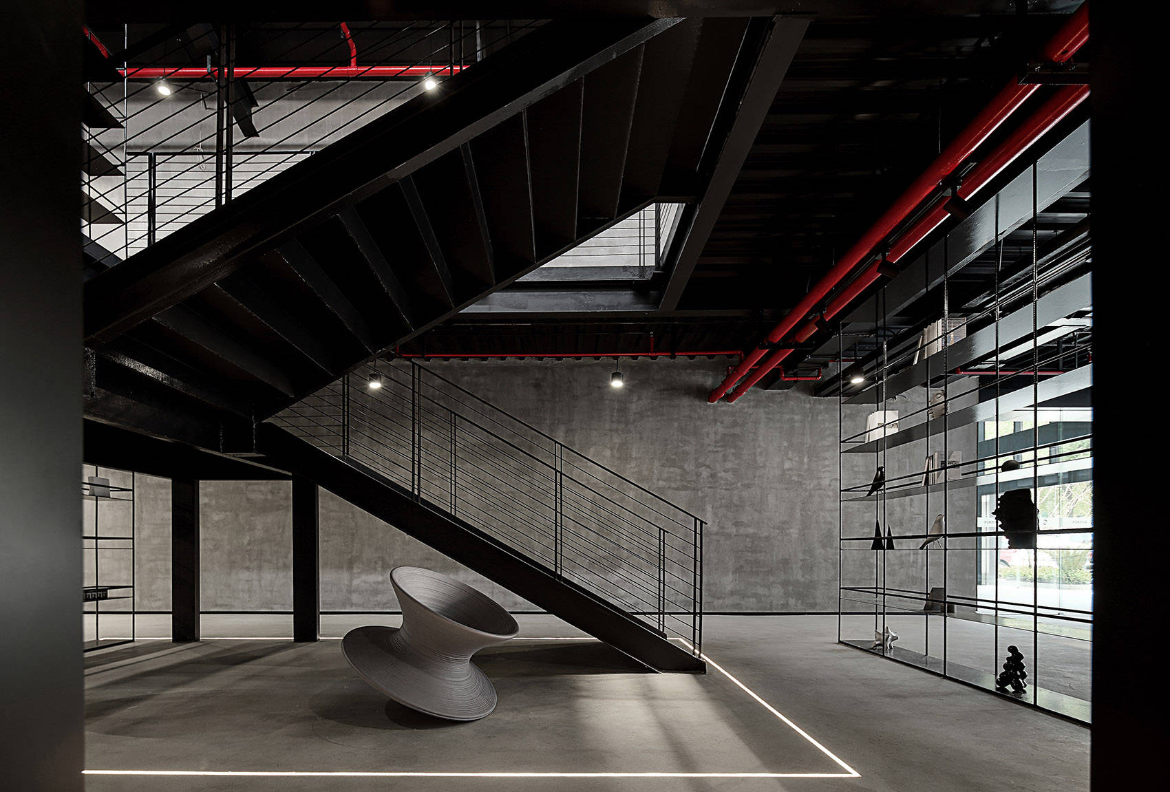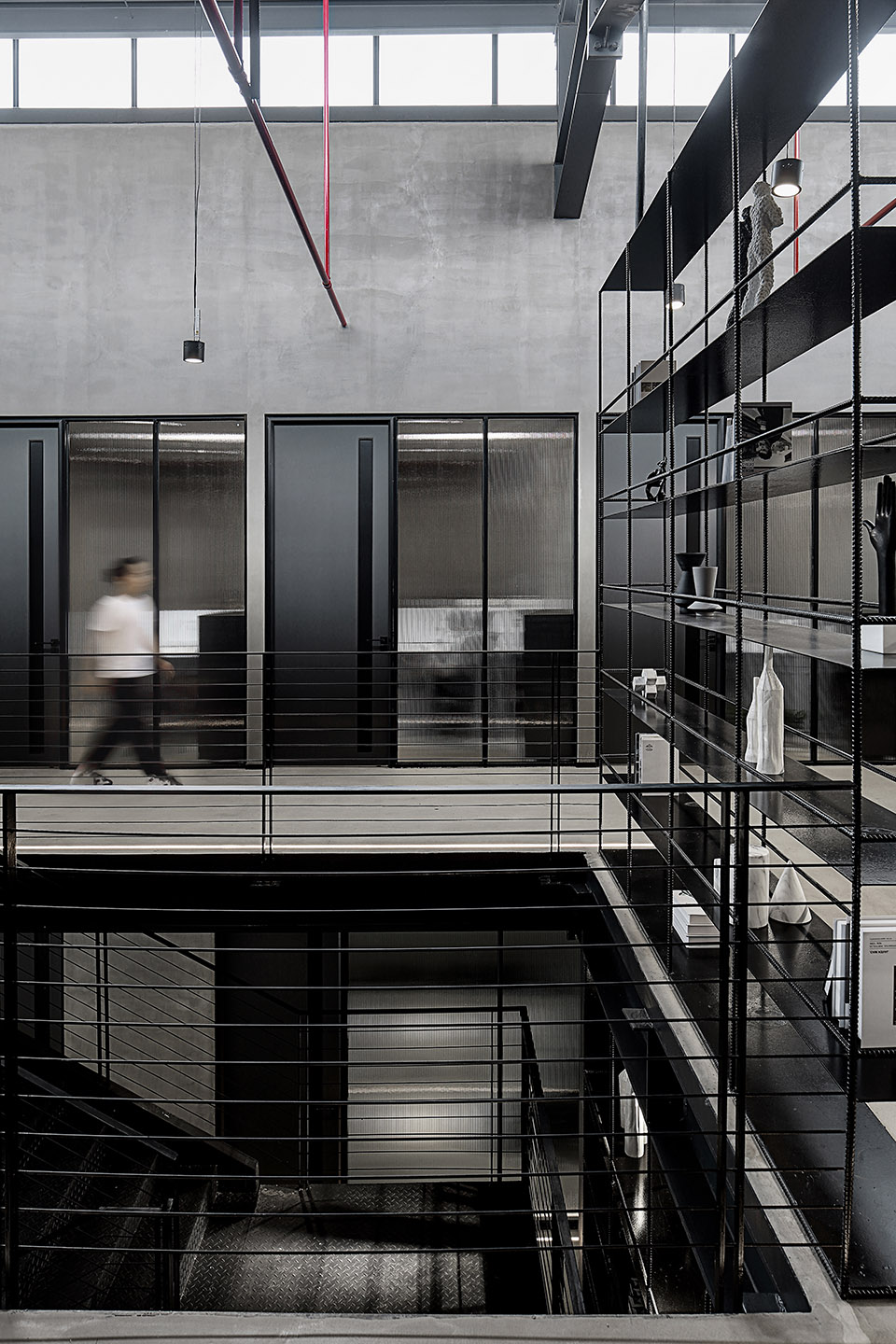 尊重原有工业空间文化,室内采用灰色水泥漆、自流平与黑色金属钢板的搭配,材质色彩呼应建筑,最终实现空间整体的平衡与统一。