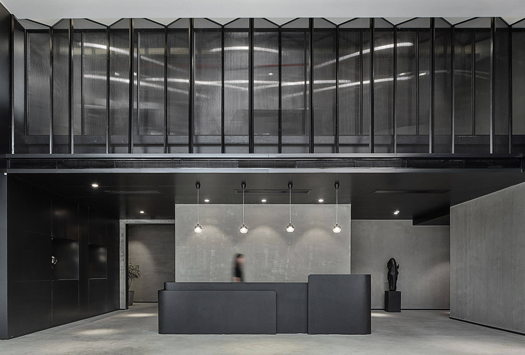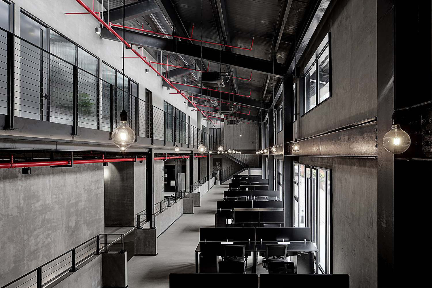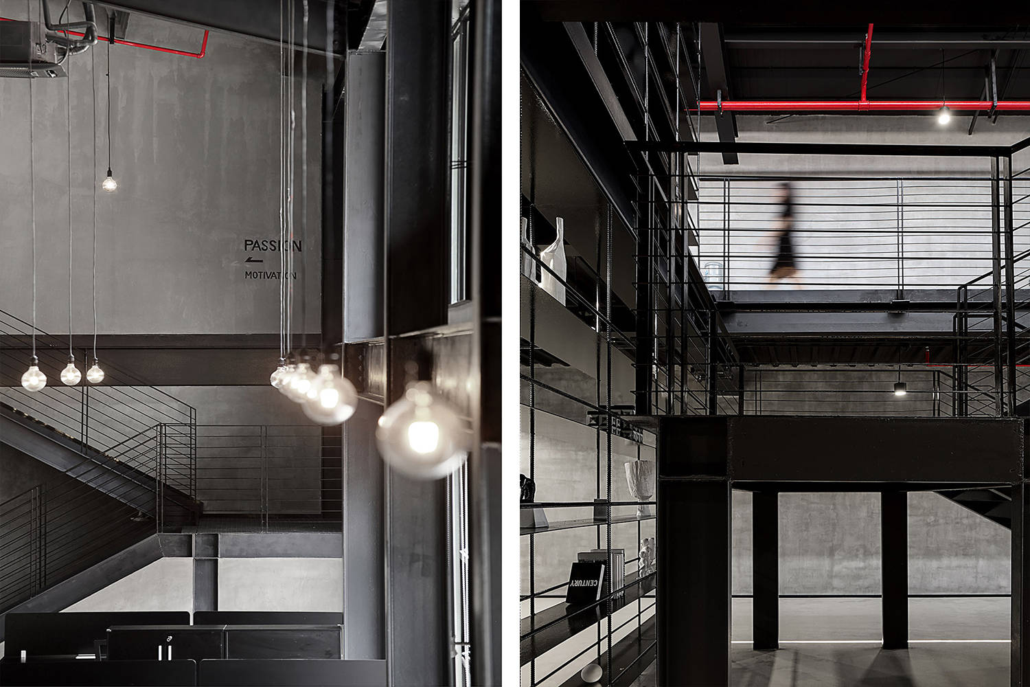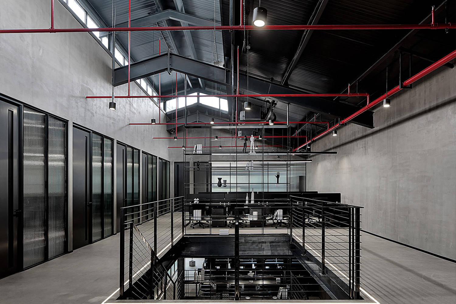 尊重原有工业空间文化,室内采用灰色水泥漆、自流平与黑色金属钢板的搭配,材质色彩呼应建筑,最终实现空间整体的平衡与统一。
