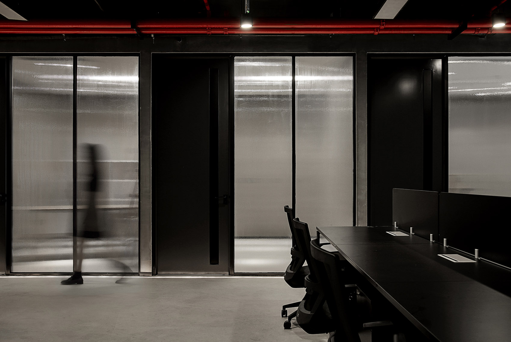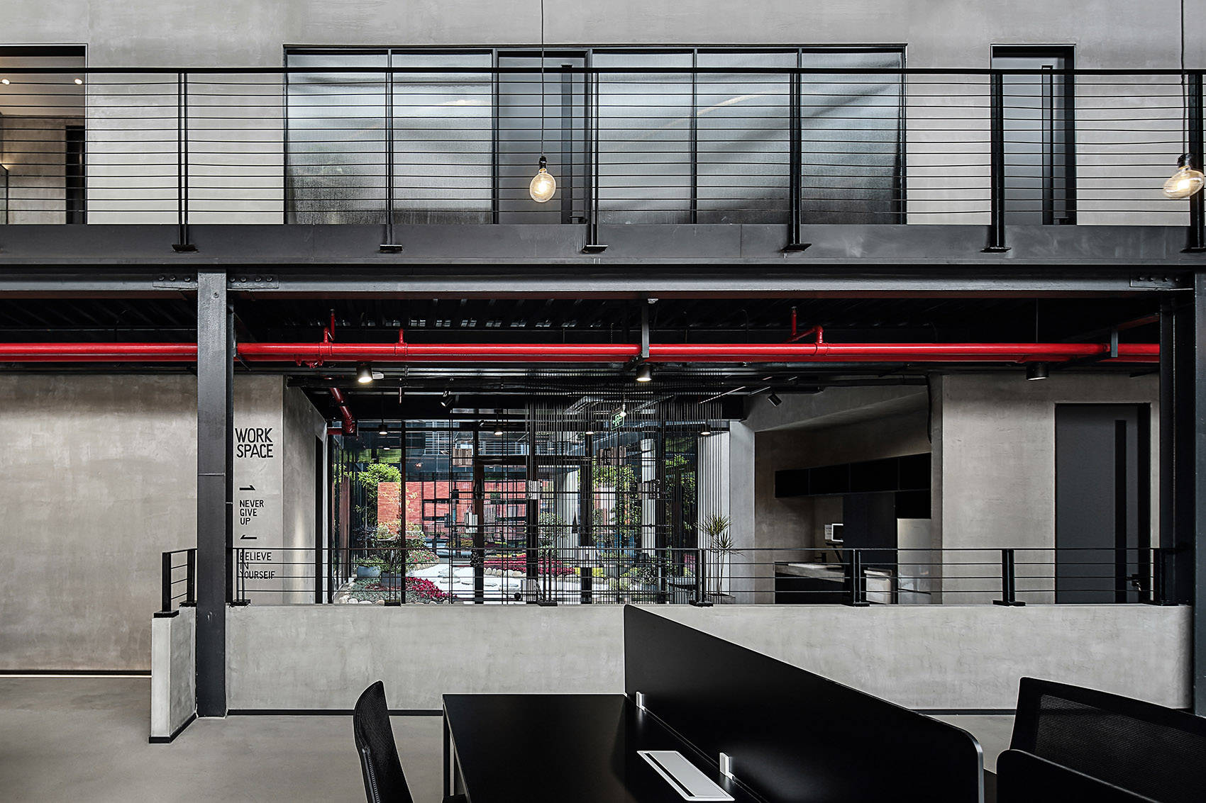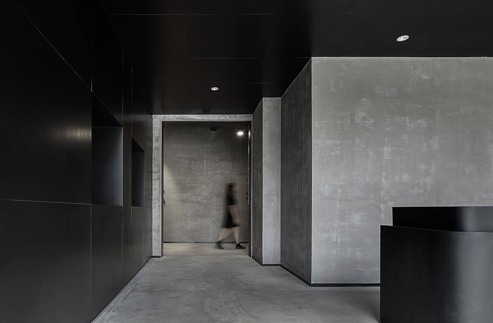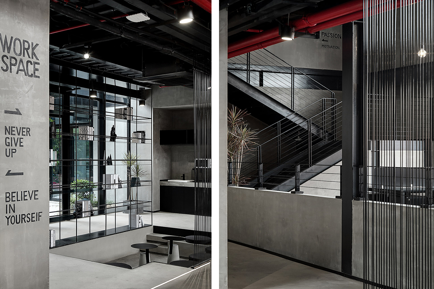 尊重原有工业空间文化,室内采用灰色水泥漆、自流平与黑色金属钢板的搭配,材质色彩呼应建筑,最终实现空间整体的平衡与统一。