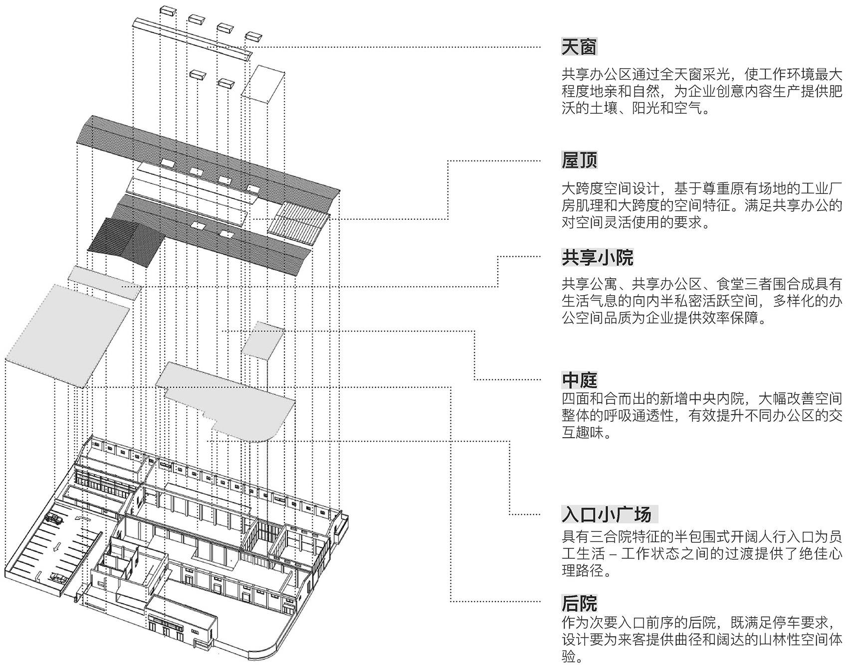 相异于一般的功能为主体之设计原则,本改造案在以传统合院中的院落空间作为第一组织要素,四面合围而岀,灵活布局各功能区域,旨在为紧张工作的员工提供充足的休憩活动场地。创新型企业的人本文化内核呼之欲出。